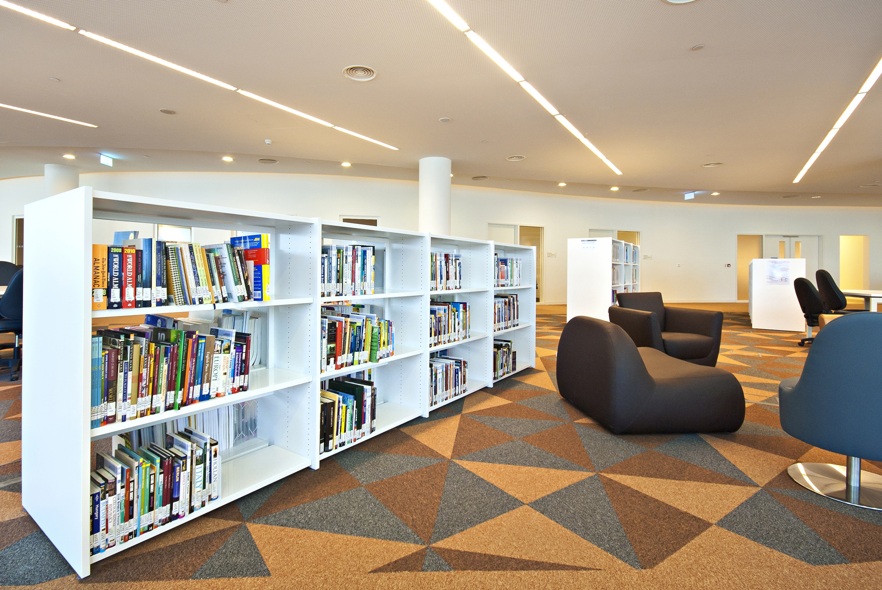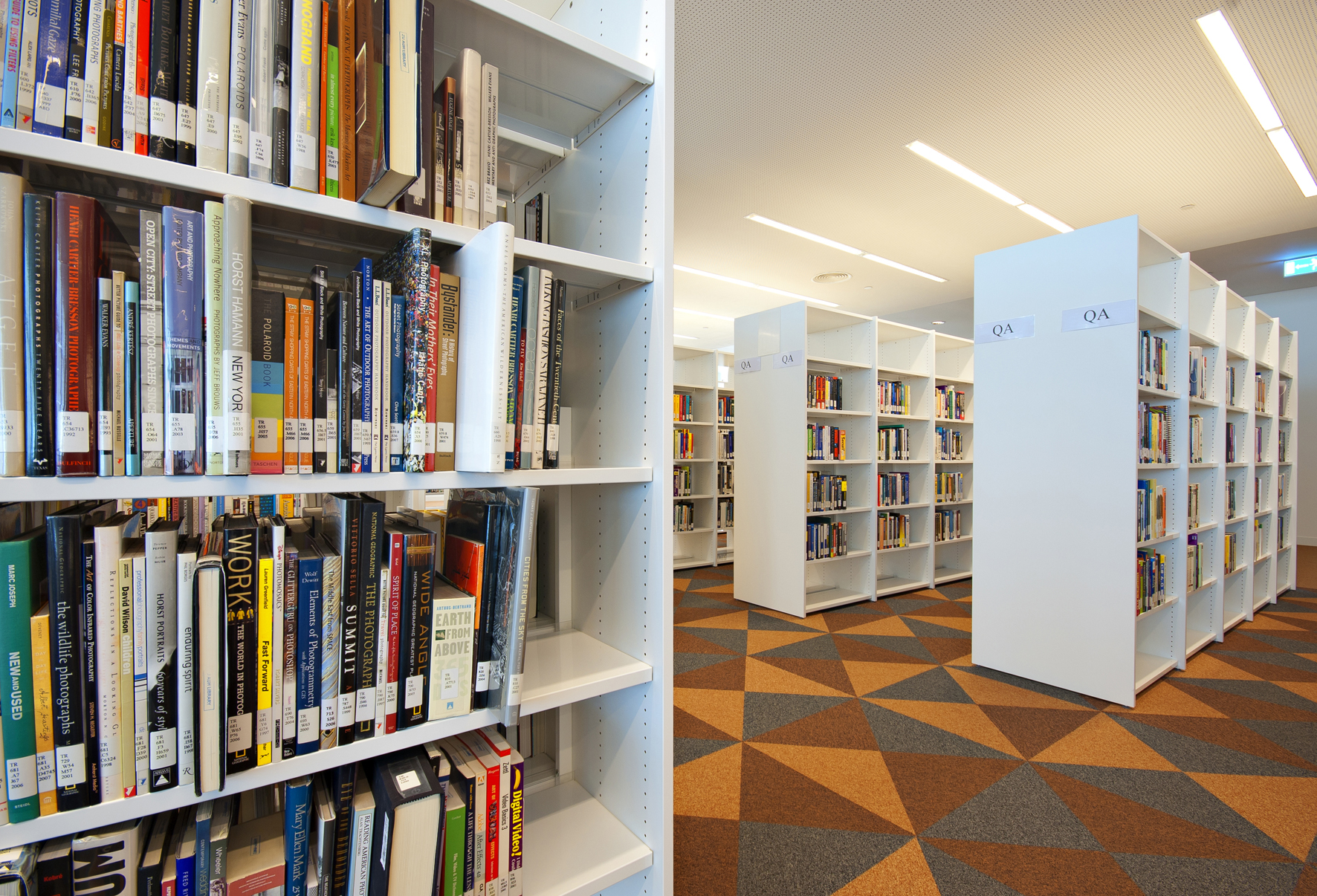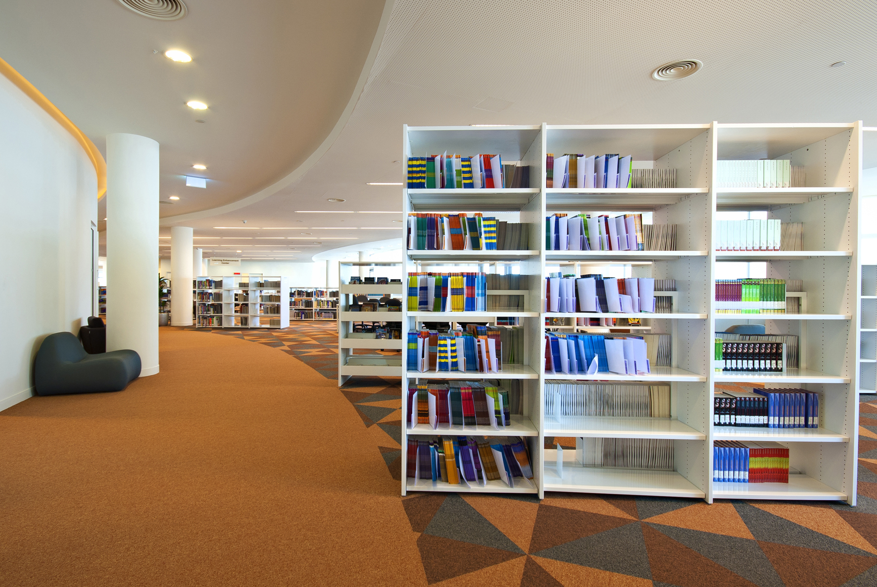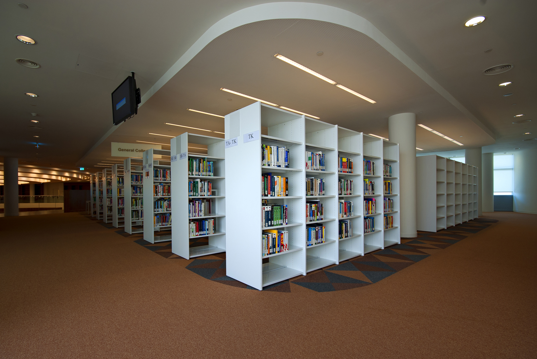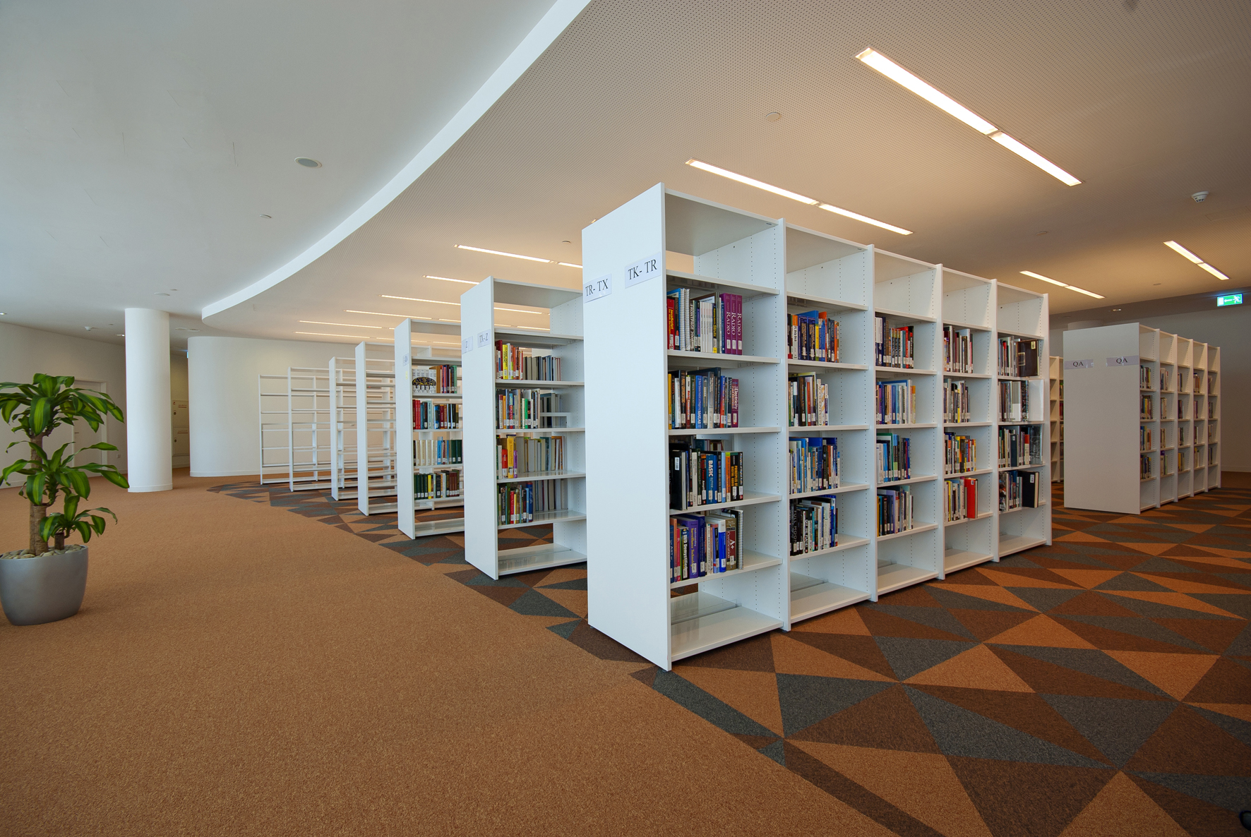 Den fire etagers biblioteksbygning er formet som et gradueret amfiteater, baseret på designet af US Library of Congress. Når du træder ind, møder du en ren og afslappende atmosfære, som er skabt med BCI’s Slimline reol system i hvid finish. En 18.000 m2 stor oase for viden og information.