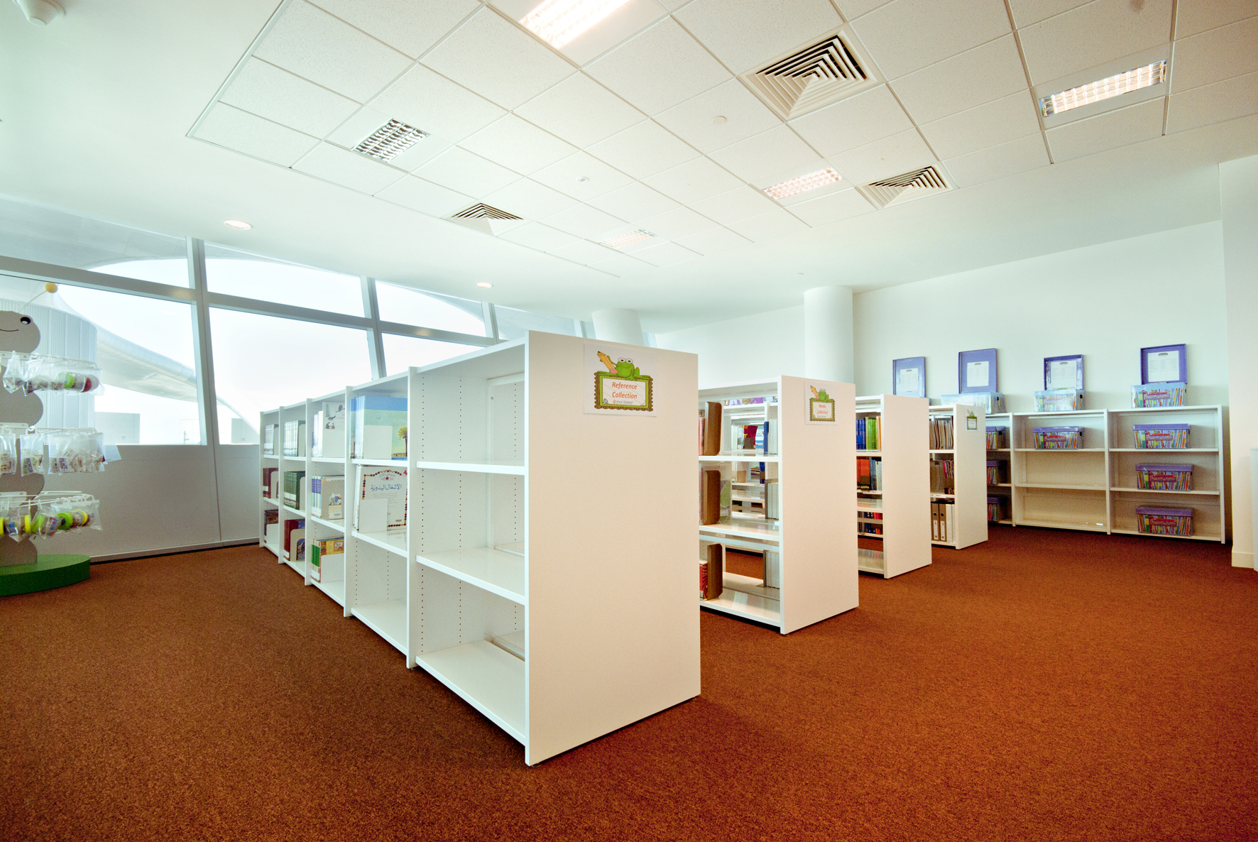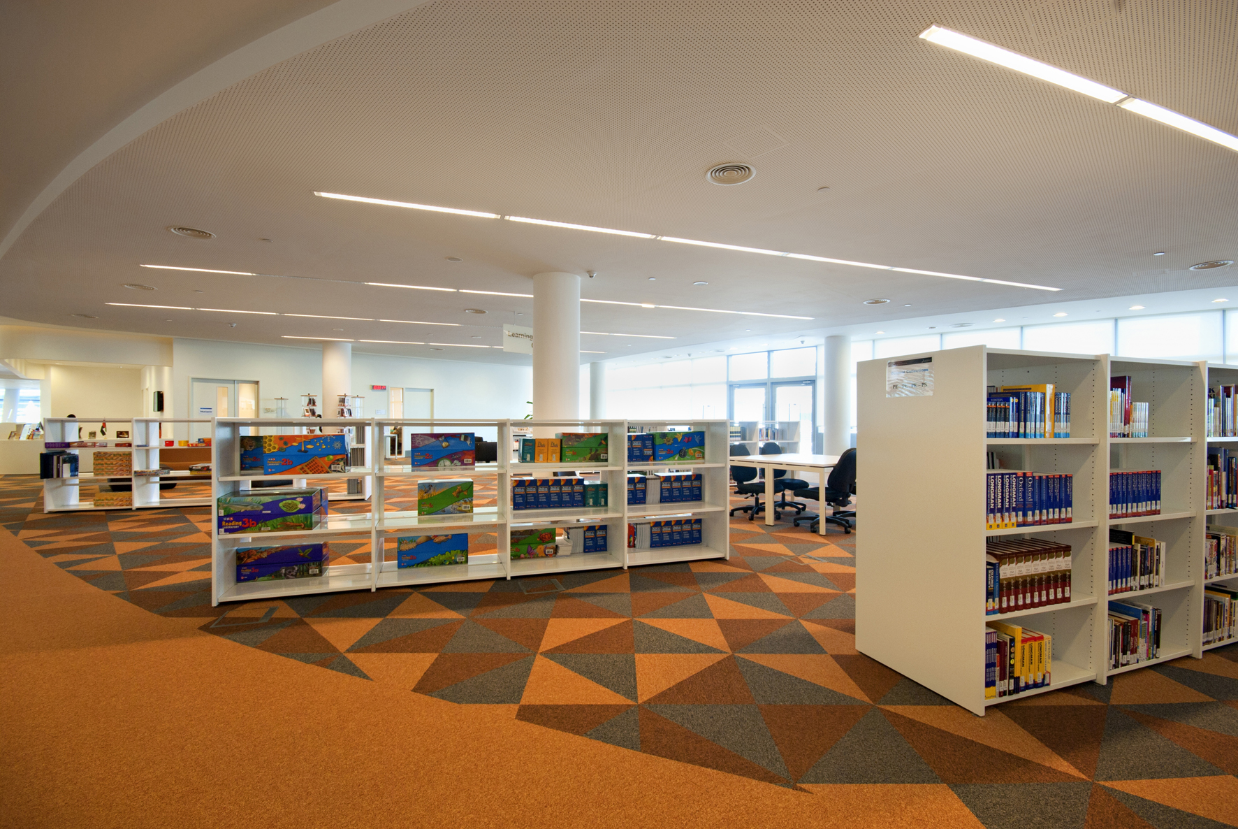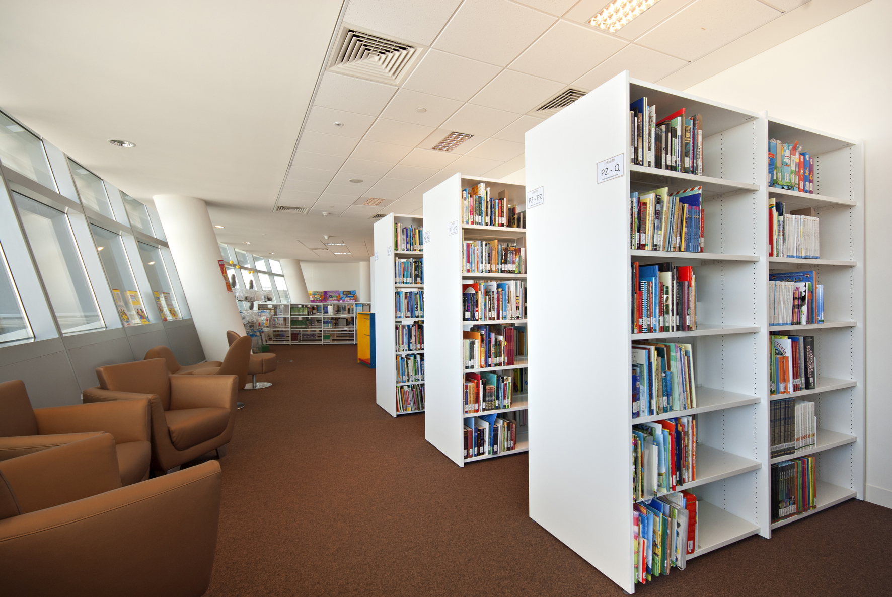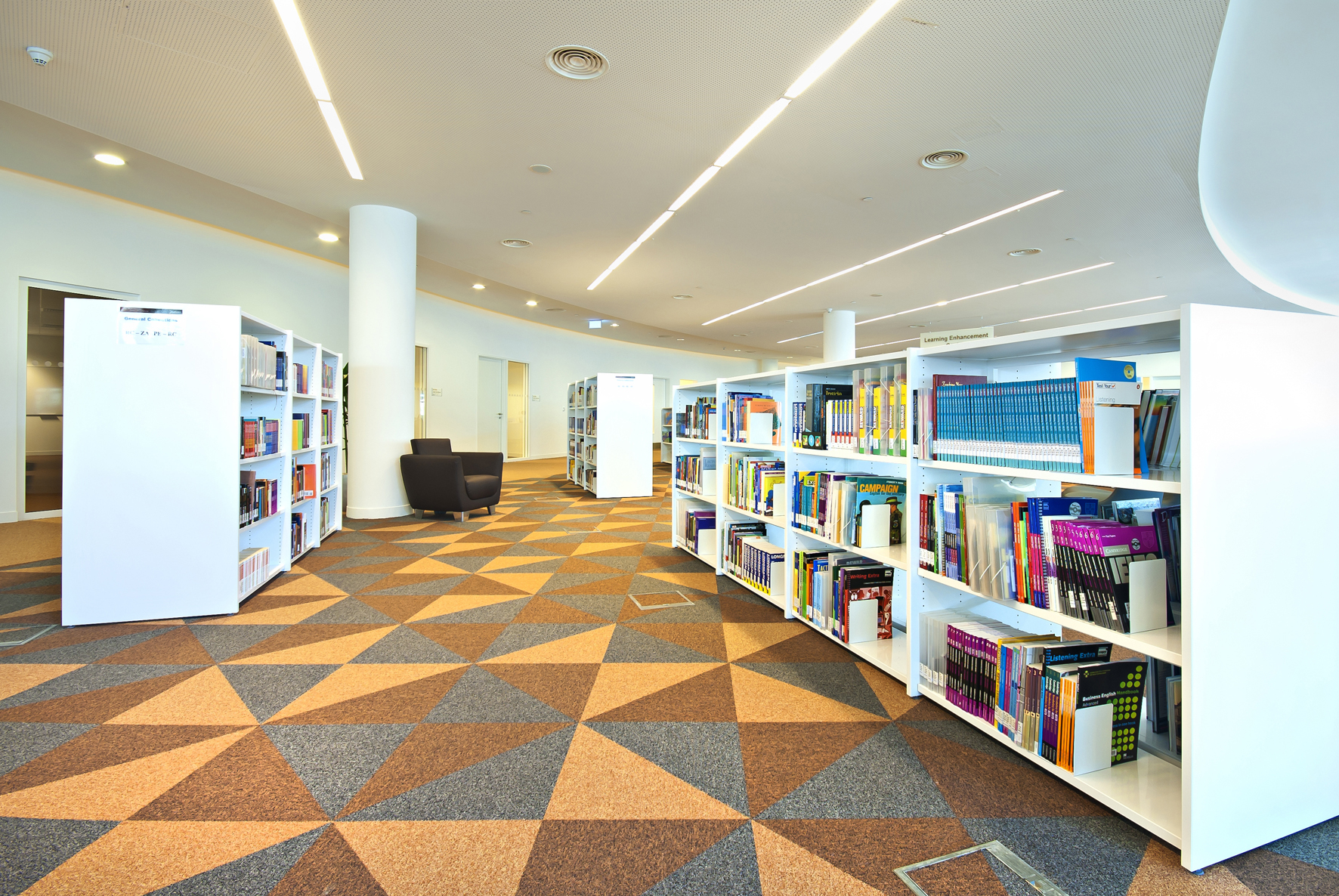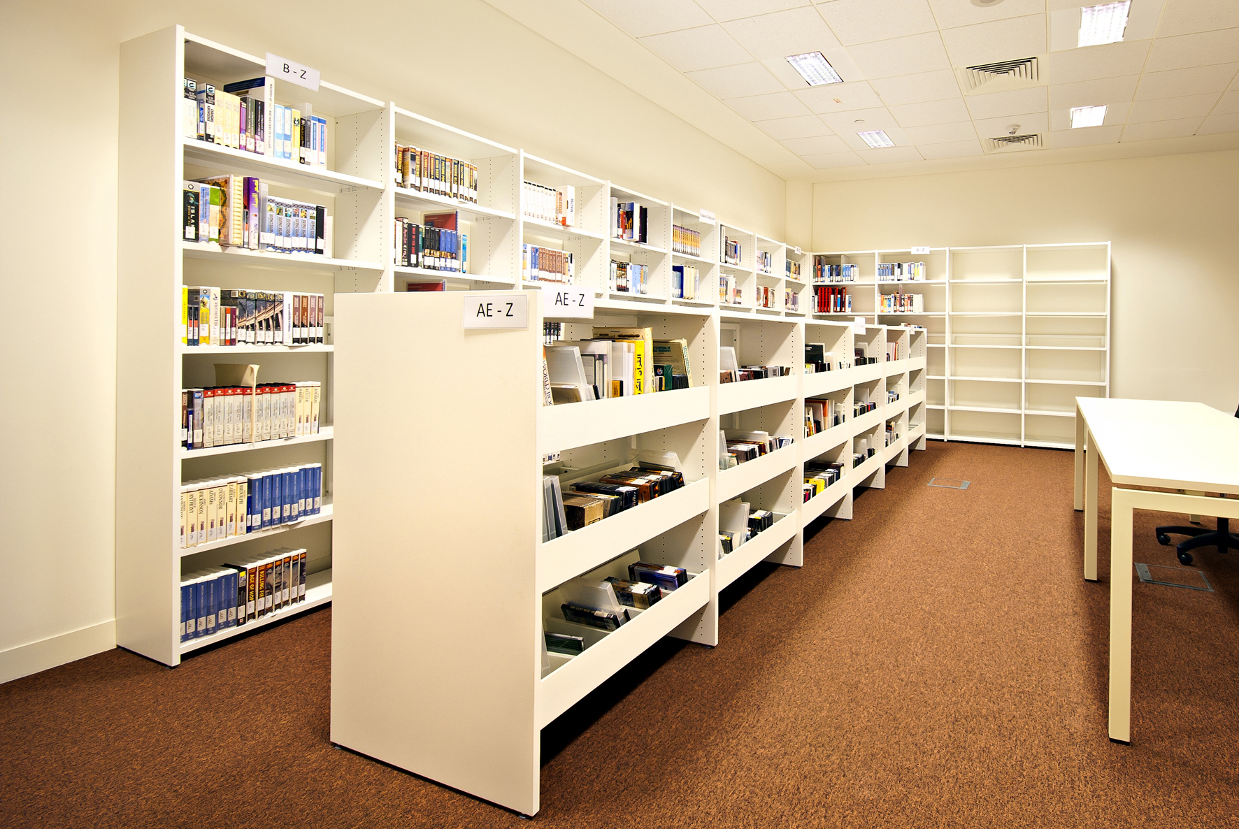 Den fire etagers biblioteksbygning er formet som et gradueret amfiteater, baseret på designet af US Library of Congress. Når du træder ind, møder du en ren og afslappende atmosfære, som er skabt med BCI’s Slimline reol system i hvid finish. En 18.000 m2 stor oase for viden og information.