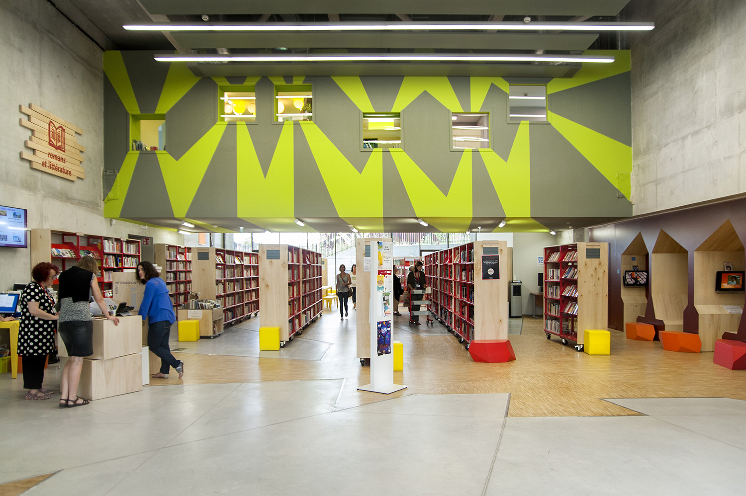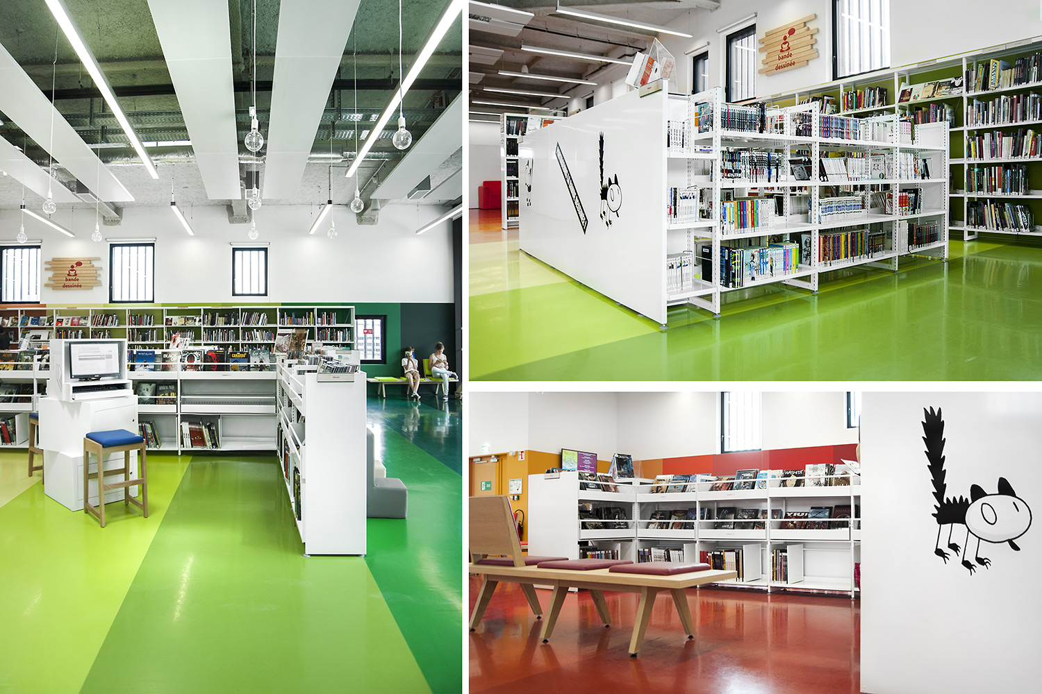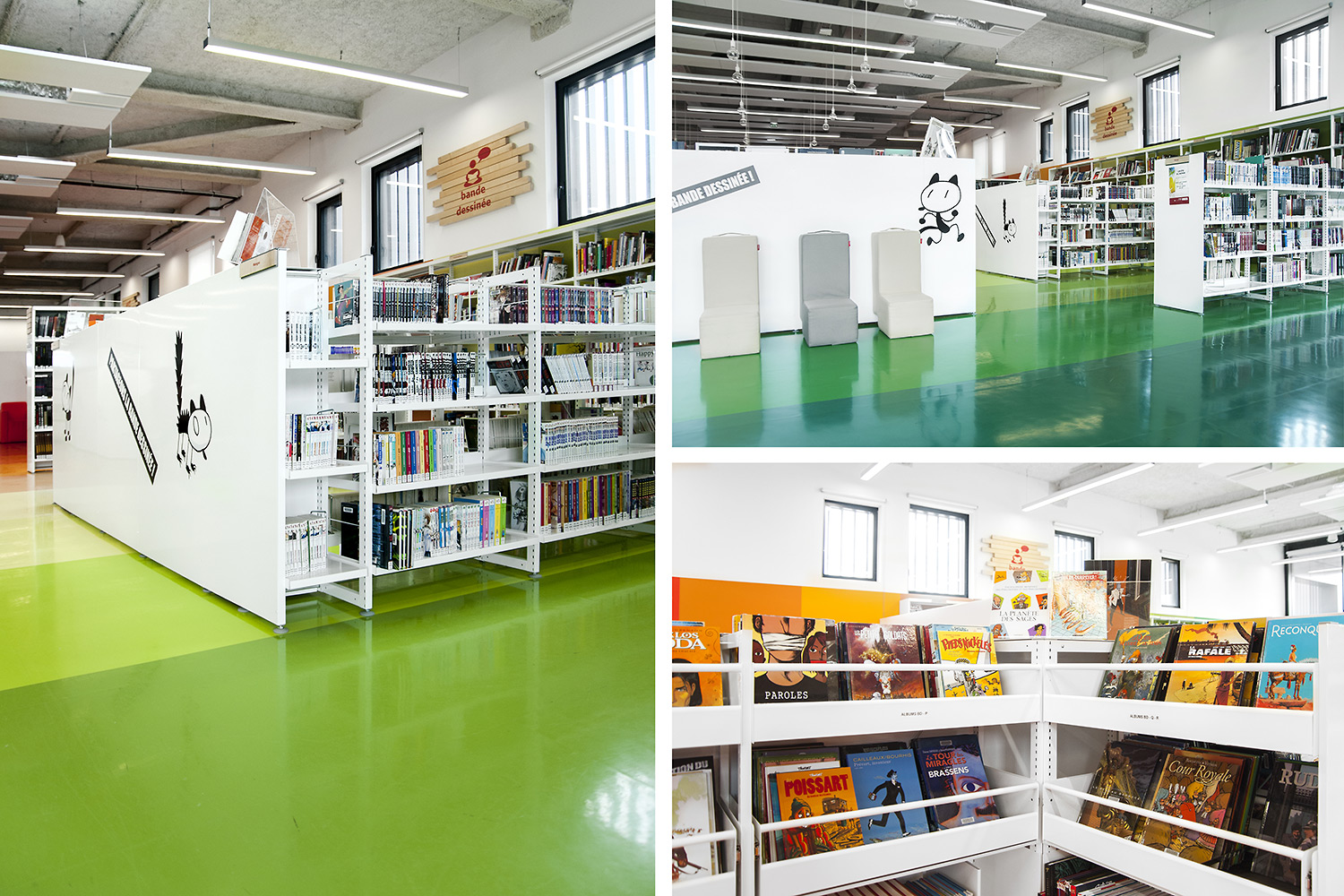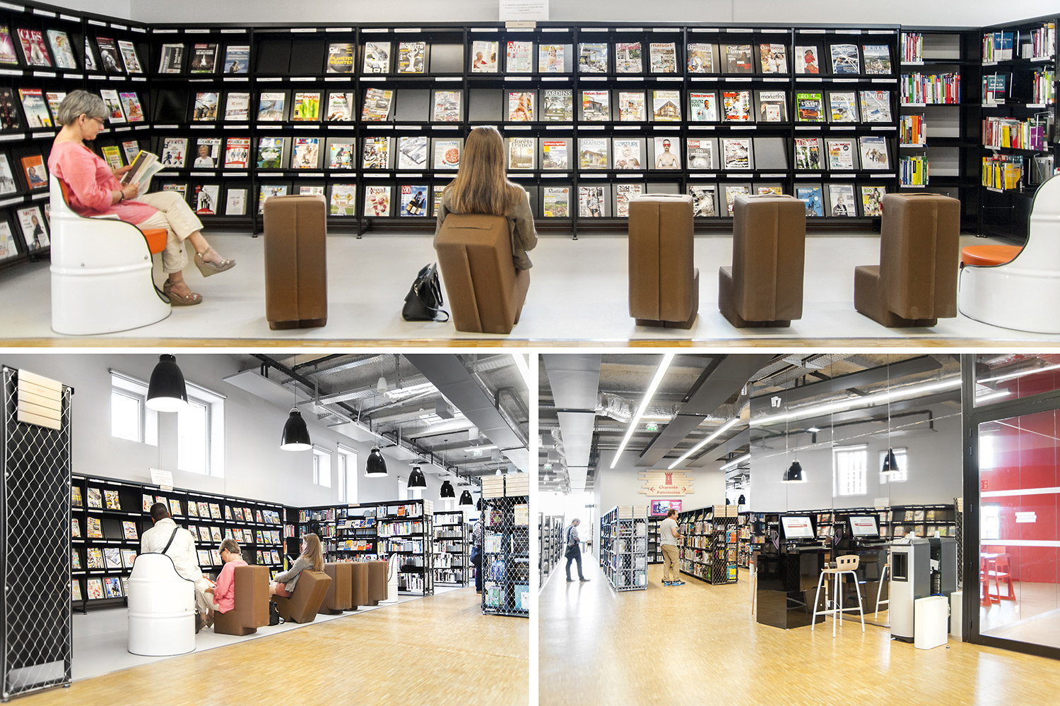 Biblioteket er bygget op omkring 3 uiverser: Fantasi, Skabelse og Forståelse. "Skabelse" er rum tilegnet tegnesier, biograf, musik og kunst. "Forståelse" dækker hovedområderne inden for viden og tilbyder rum og samlinger, der er dedikeret til den skriftlige kulturarv og historie i Charente regionen og tilbyder private og kollektive rum til læsning og studier. "Fantasi" bringer børn og litteratur sammen og giver adgang til gårdspladsen og auditoriet.