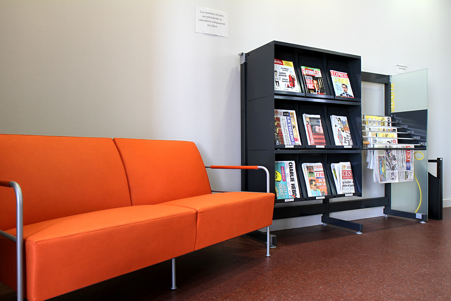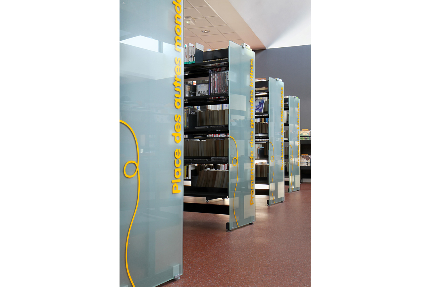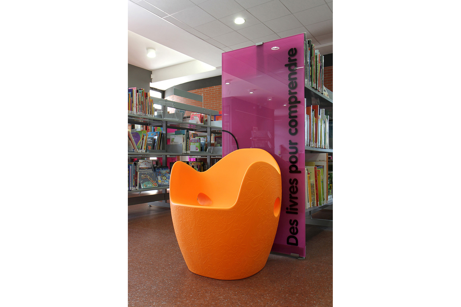 With its dedicated areas for multimedia and the toy library, La Filoche media library has a two-level structure. The interior design combines wood with industrial materials. The play areas for children are bright and awash with colour, and the rest of the library is transparent, light and airy. The Classic Steel Shelving System has been enhanced with multi-coloured acrylic end panels.