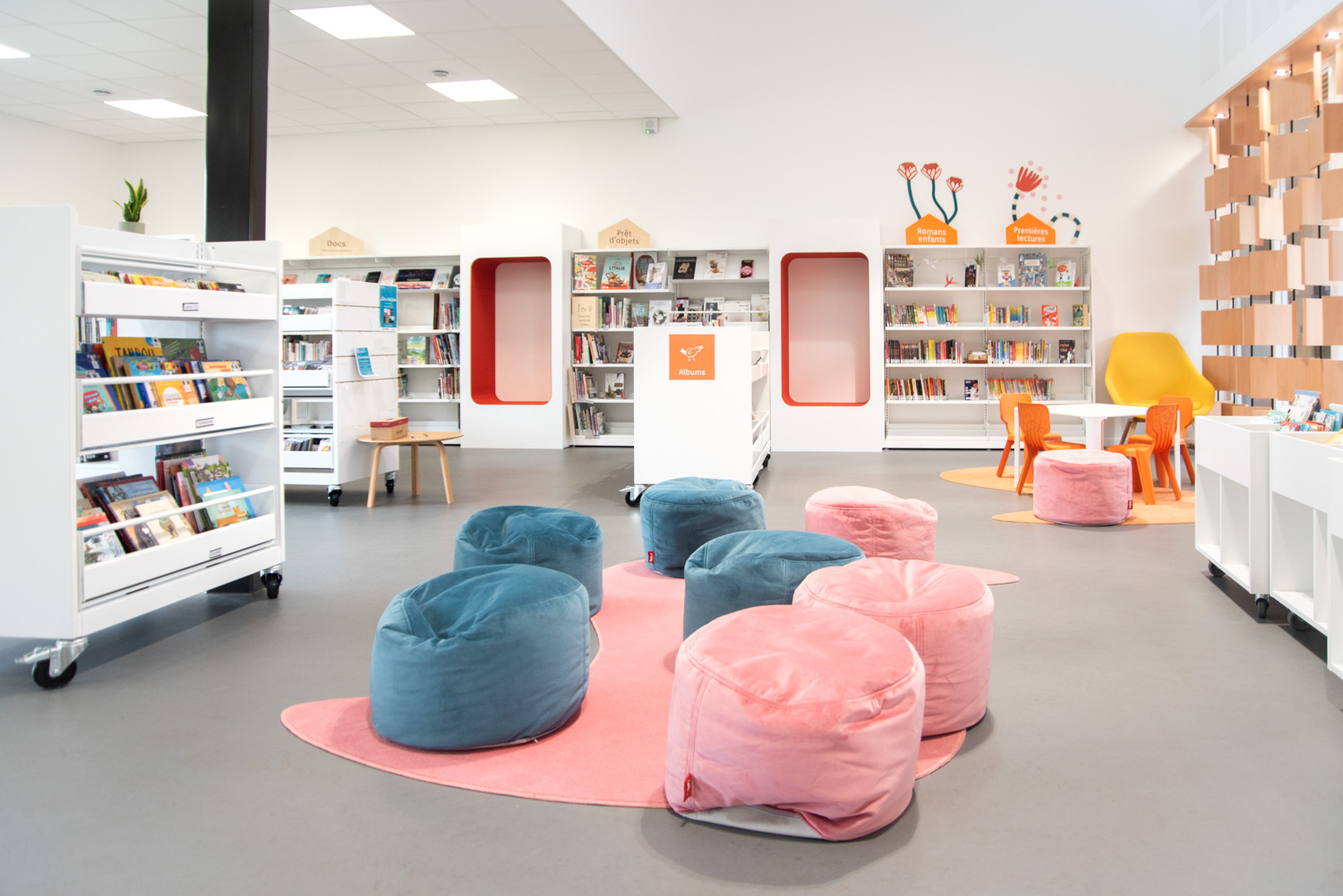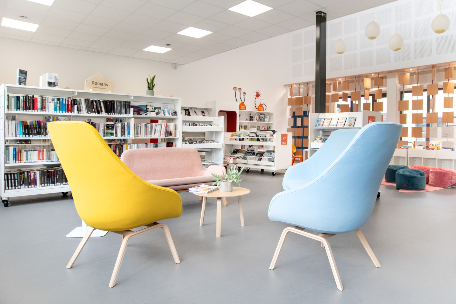 I biblioteket er der tilføjet flere siddeområder, blandt andet vertikale Cocoon og siddepuffer, der skaber rum til afskærmet og afslappet læsning.