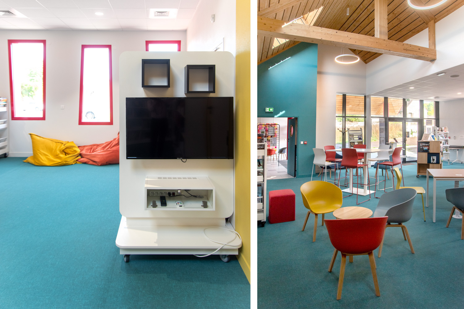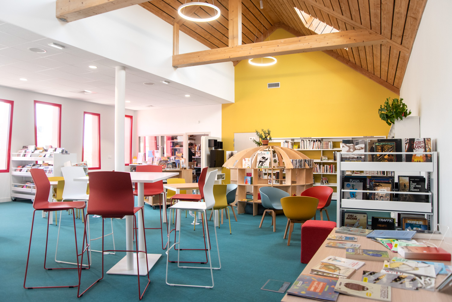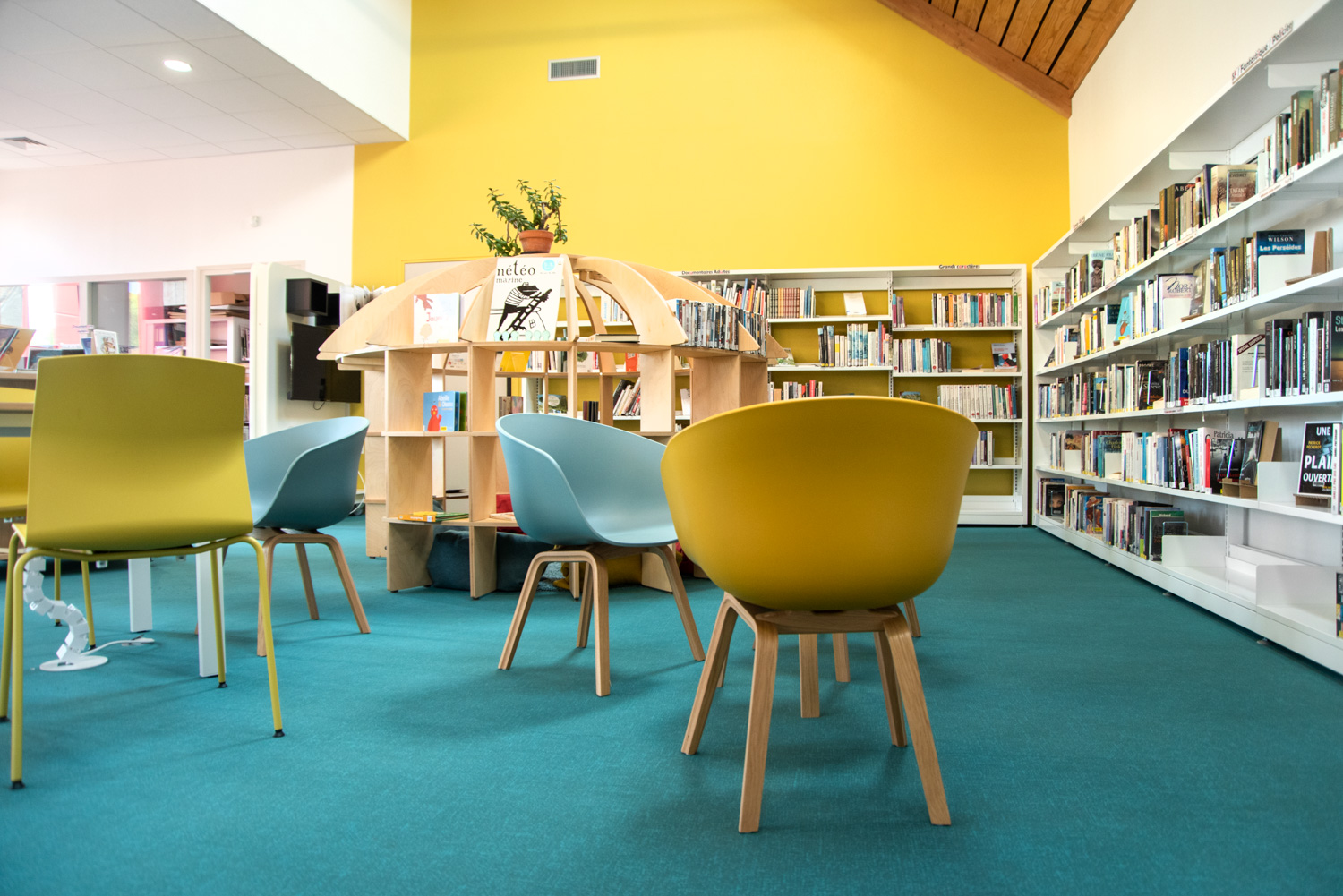Indretningen er et smukt resultat baseret på et godt samarbejde mellem arkitekten, kommunen, biblioteket og teamet fra BC Intérieur, som sammen er blevet enige om valg af møbler, farver og materialer. På et relativt lille areal (100 m²) er det lykkedes at lave et sted, som omfavner alle; Træhytten er tilflugtssted for de små, sofaen indbyder til højtlæsning fra forældre til børn, den høje bar er det ideelle mødested til samtaler og arbejde, hvor det samtidig er muligt at begrave sig dybt i en behagelig sækkestol, drikke kaffe og læse en bog i bløde lænestole... Et behageligt sted for alle.