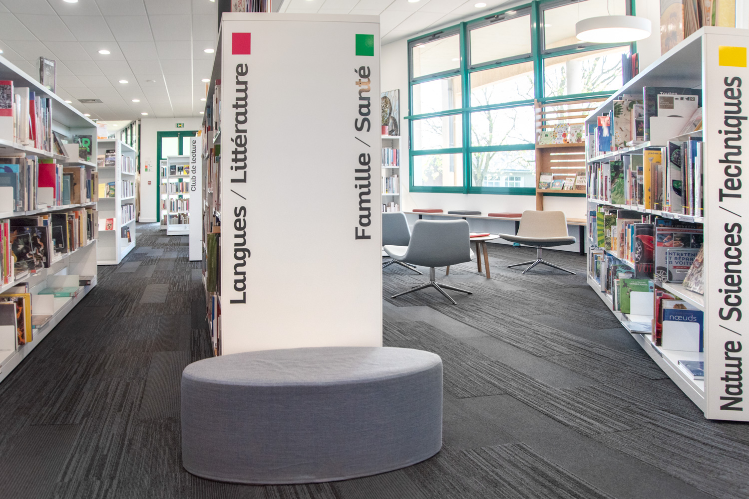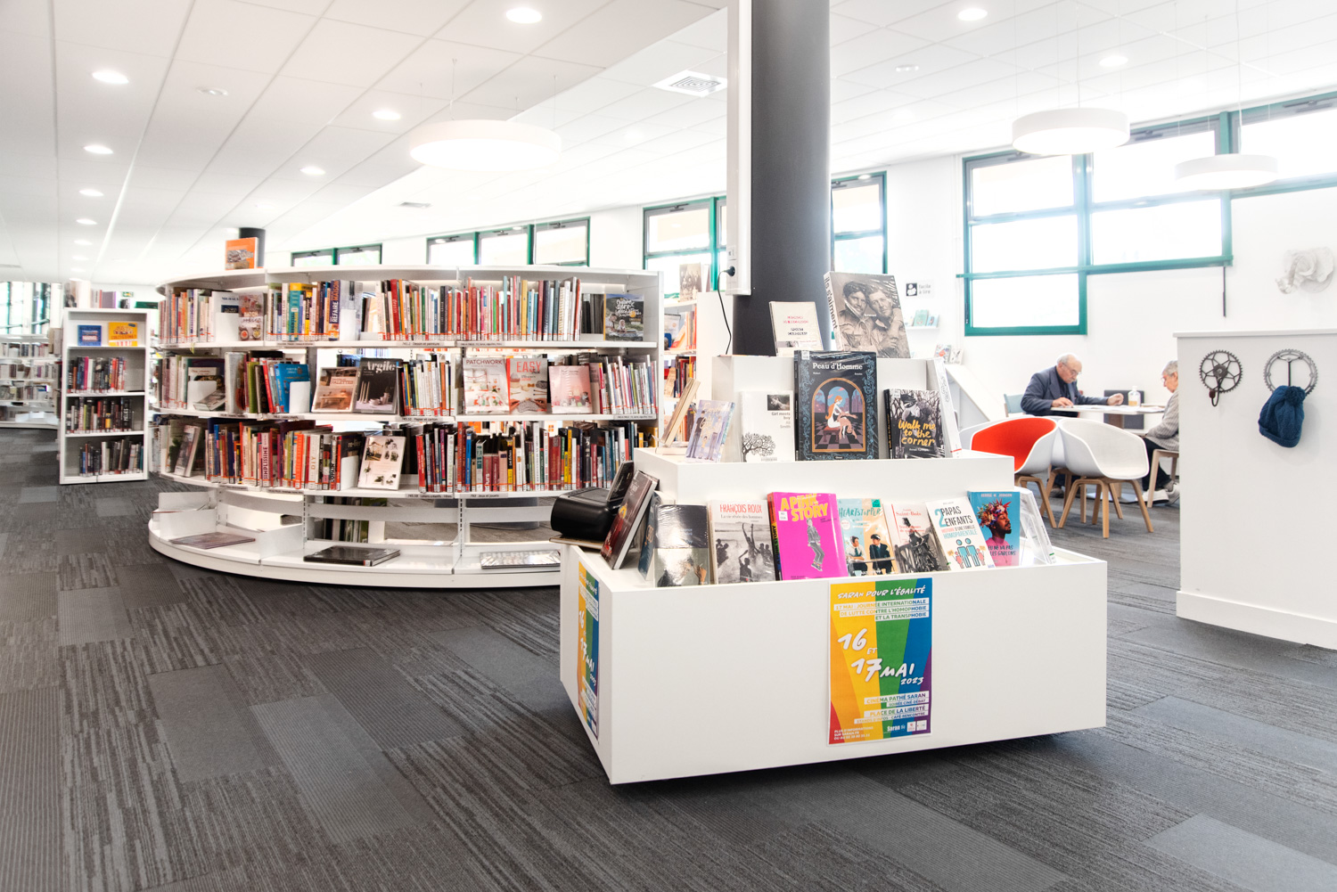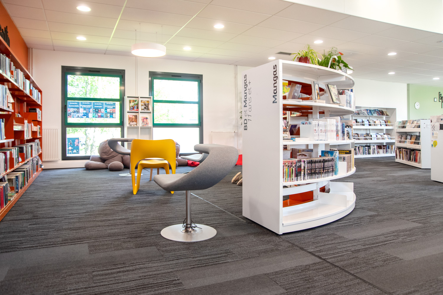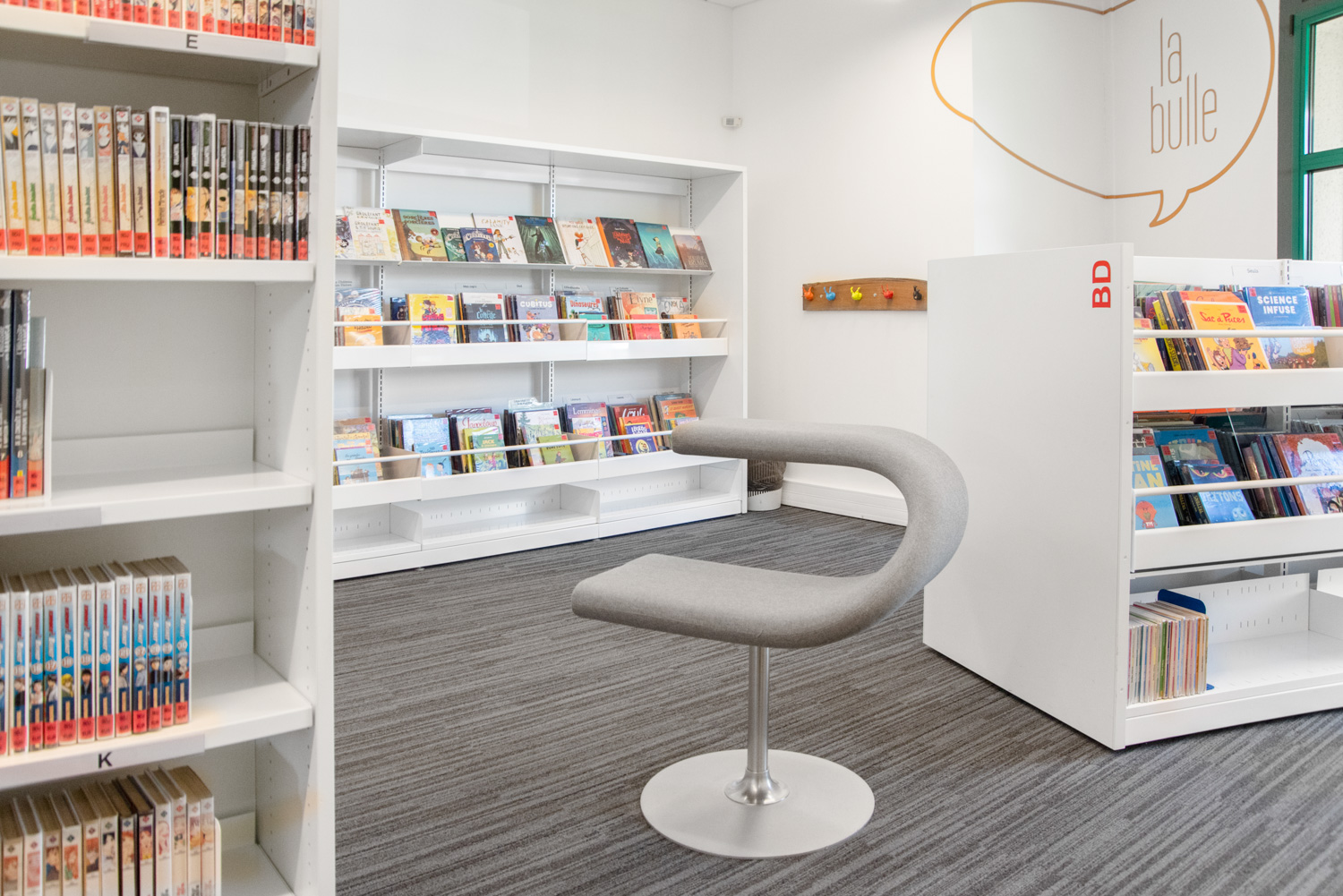I biblioteket findes der et nyt vintage-område med en gyngestol, en Coccon ved indgangen til småbørnsområdet og to store kaniner, der venter tålmodigt på de unge. En udsøgt samling af bøger og medier findes i dette flotte og helt renoverede bibliotek.