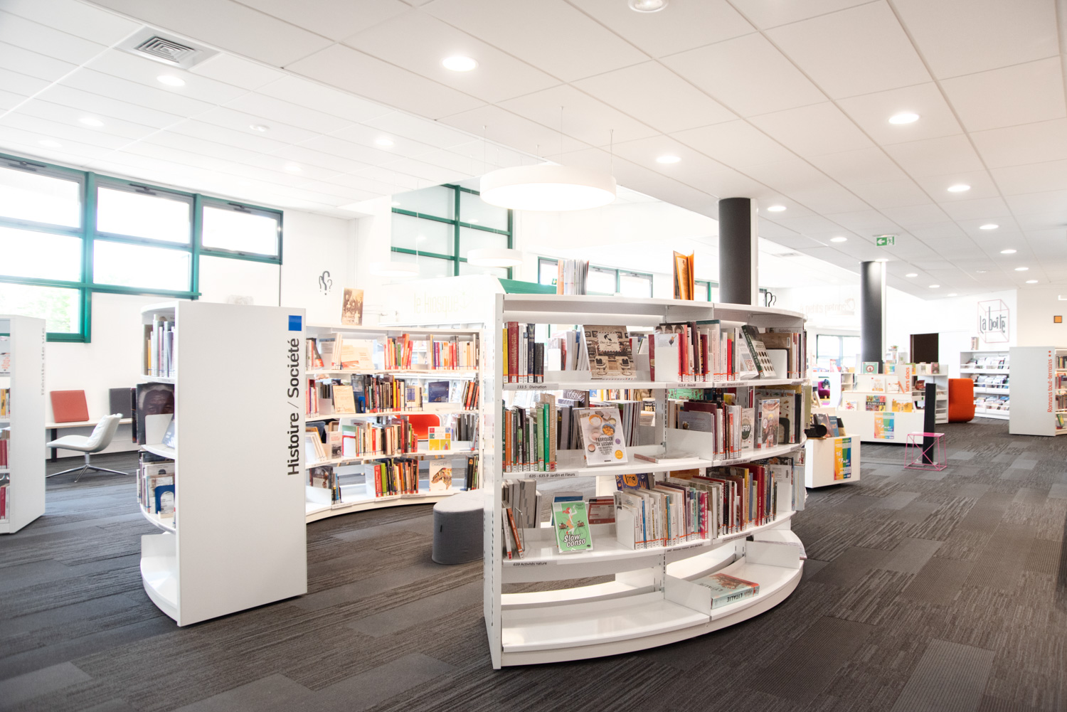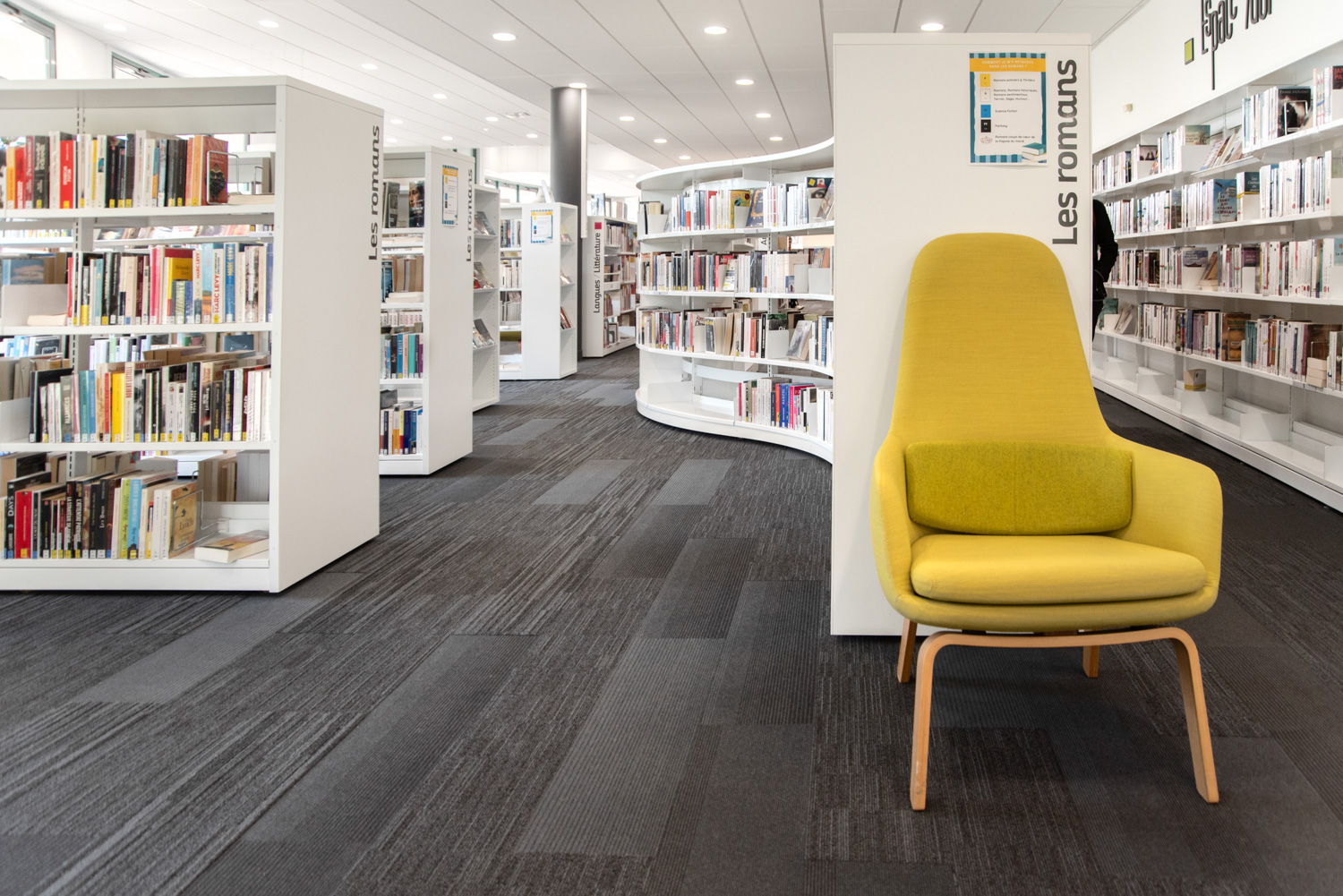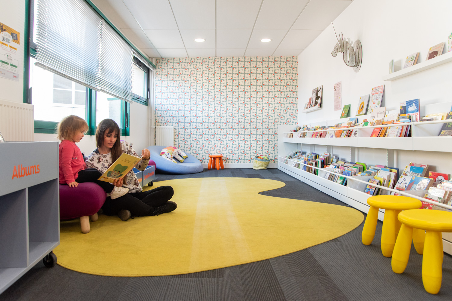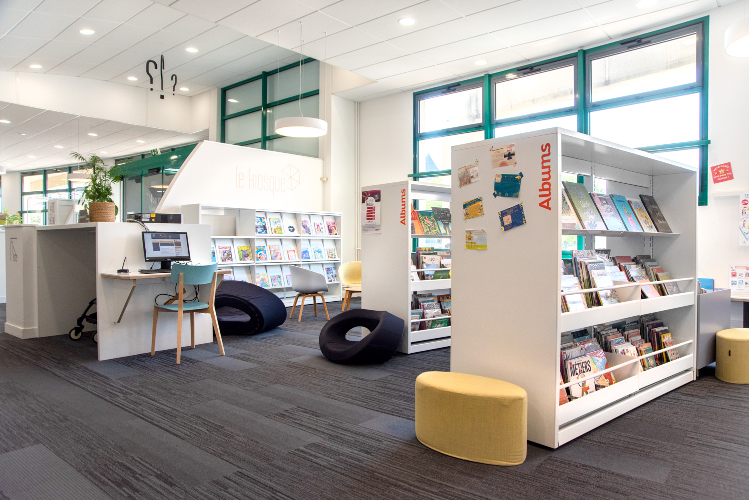 I biblioteket findes der et nyt vintage-område med en gyngestol, en Coccon ved indgangen til småbørnsområdet og to store kaniner, der venter tålmodigt på de unge. En udsøgt samling af bøger og medier findes i dette flotte og helt renoverede bibliotek.