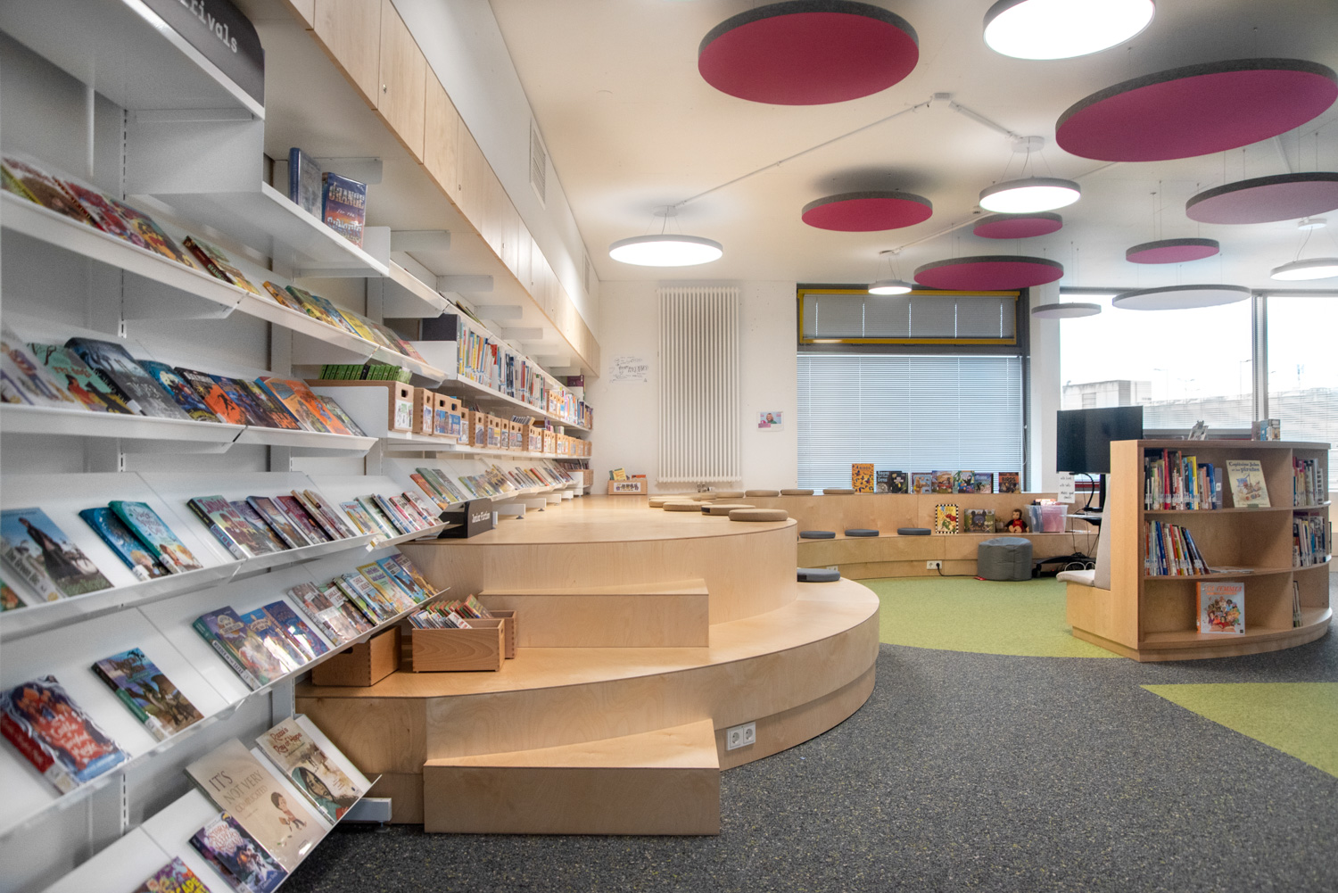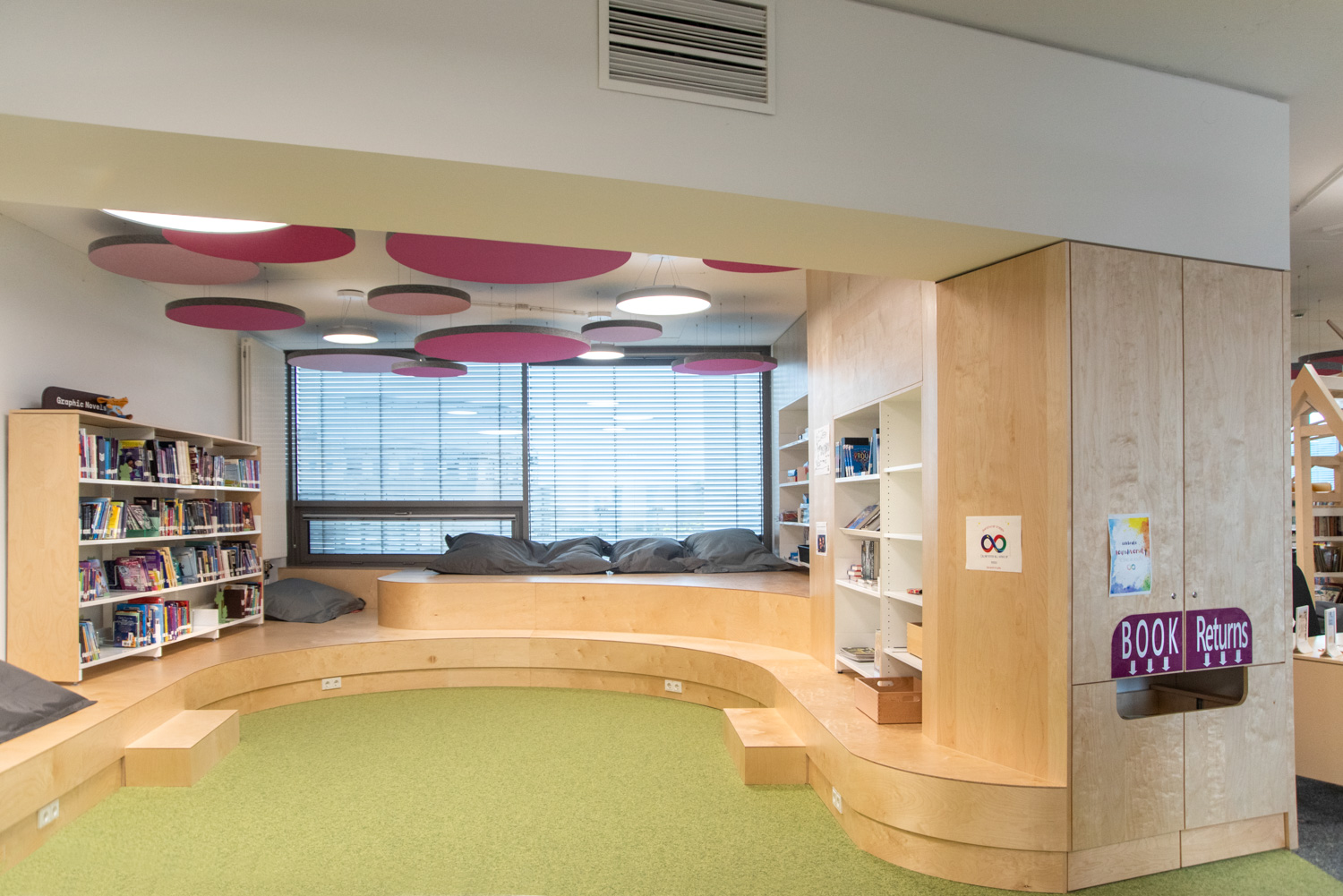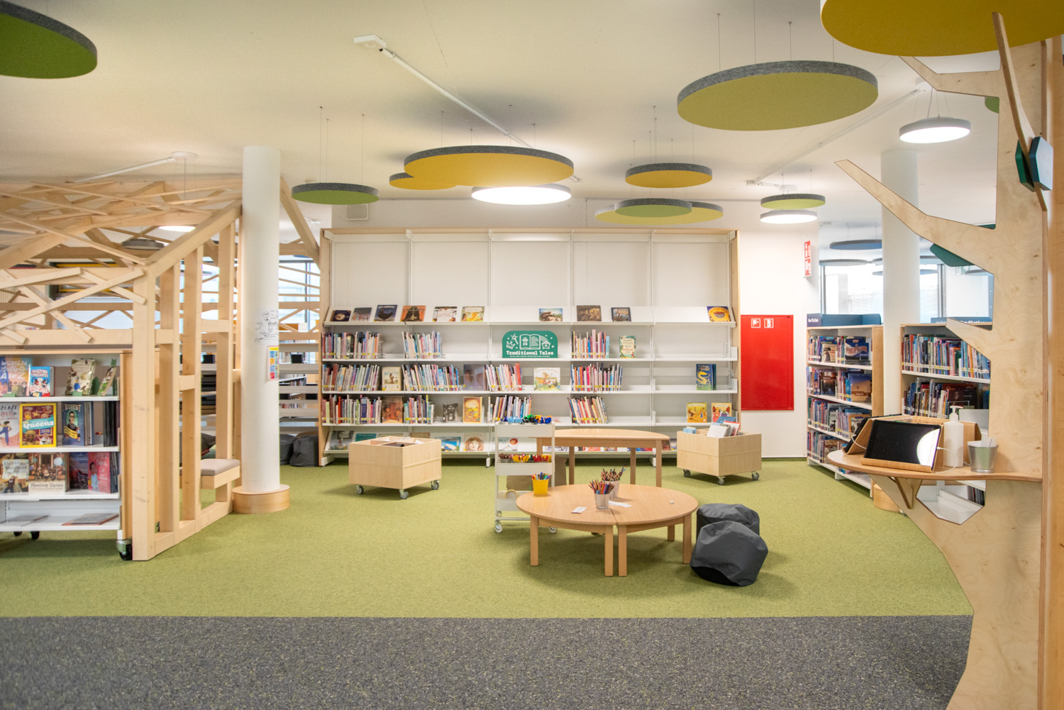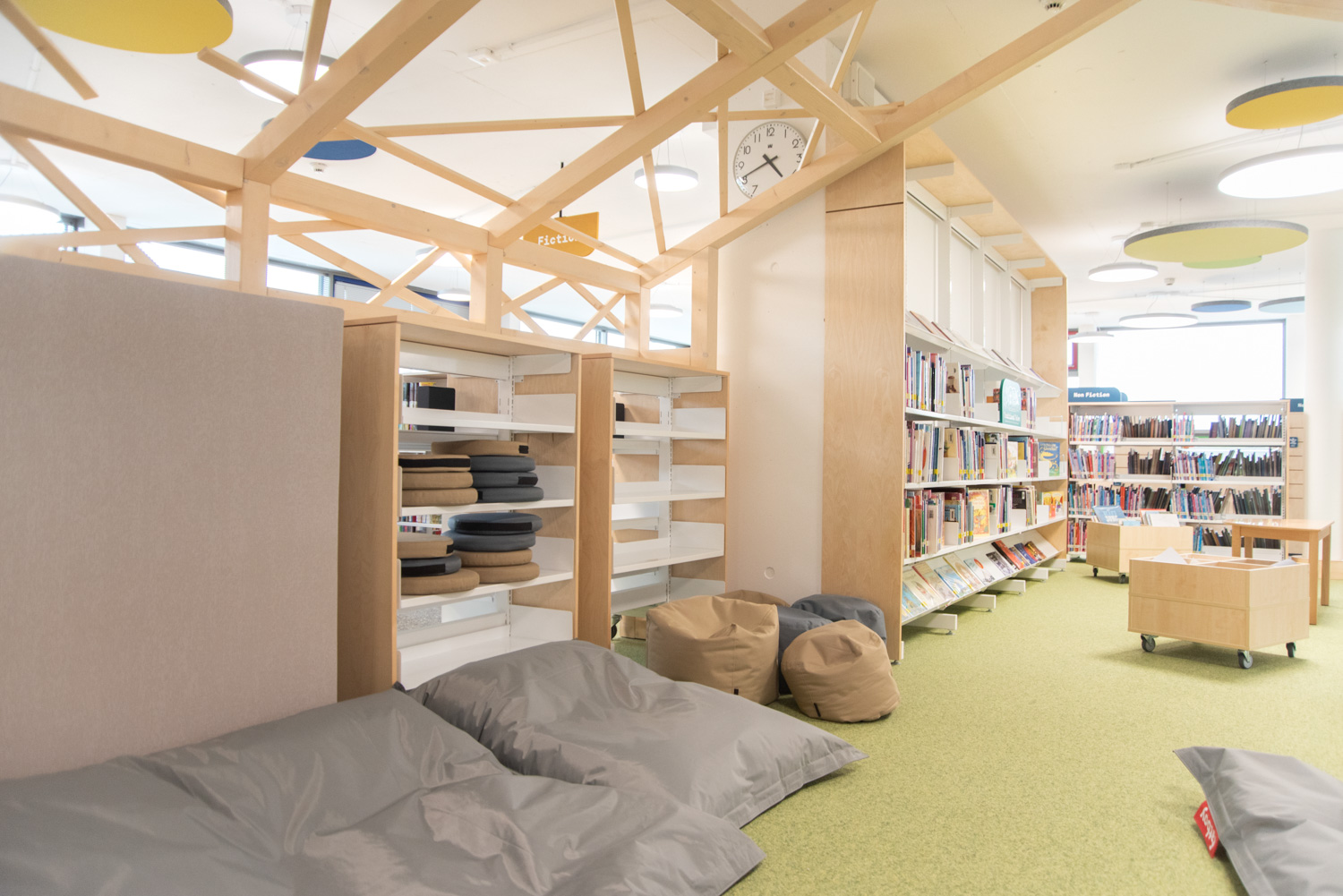 Akustiske loftøer i forskellige farver giver en flot kontrast til gulvbelægningen. På reolernes endegavle er der plads til attraktiv skiltning tilpasset besøgendes behov. Biblioteket er med til at understøtte børn i deres udvikling mod at blive informationskyndige, globale borgere.