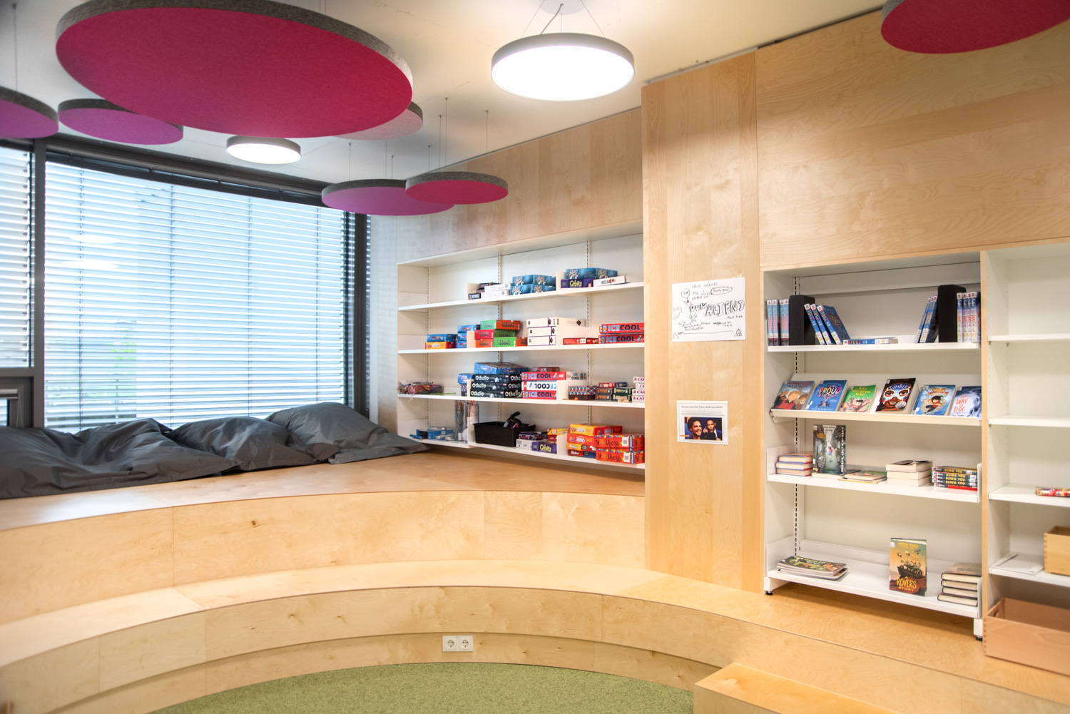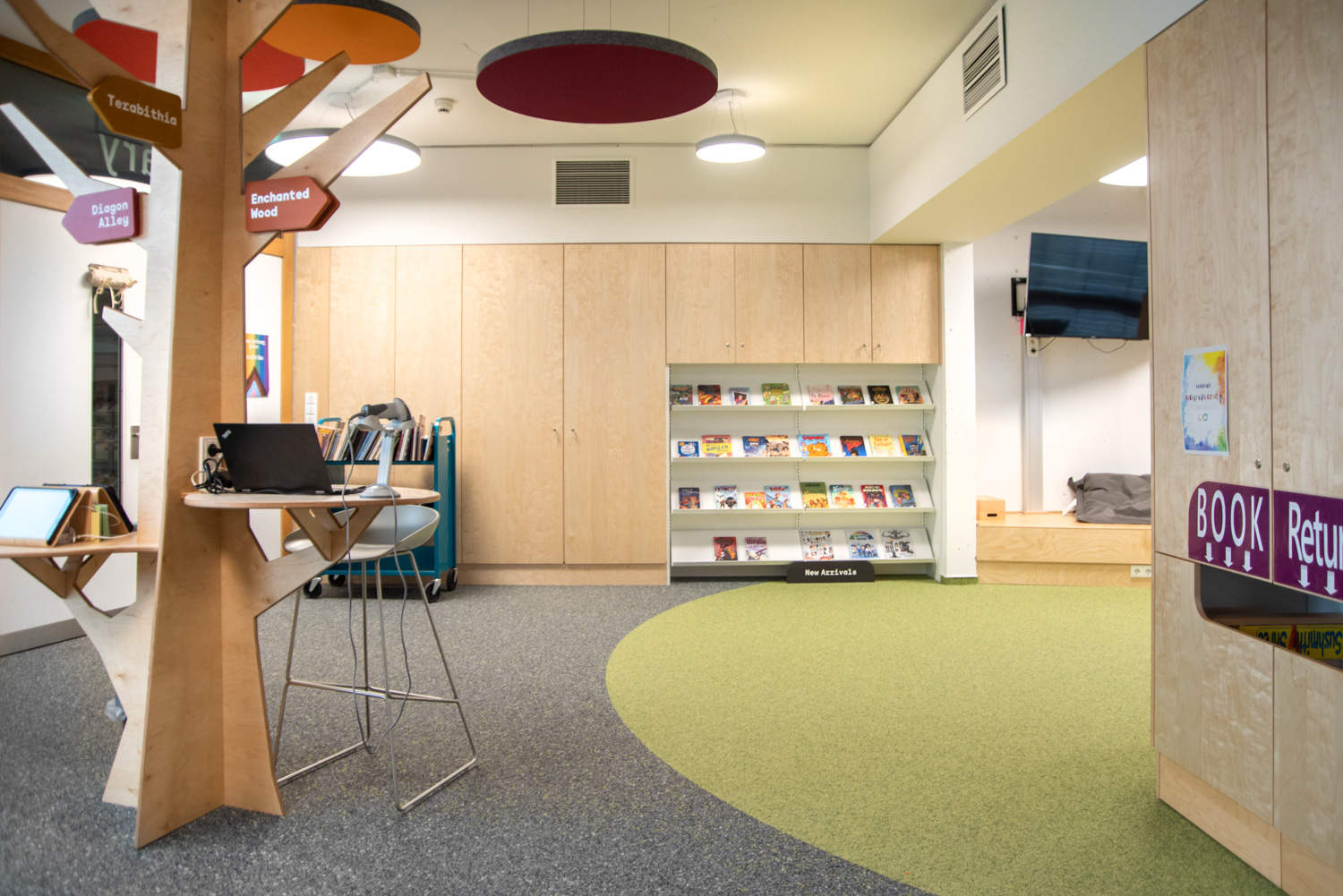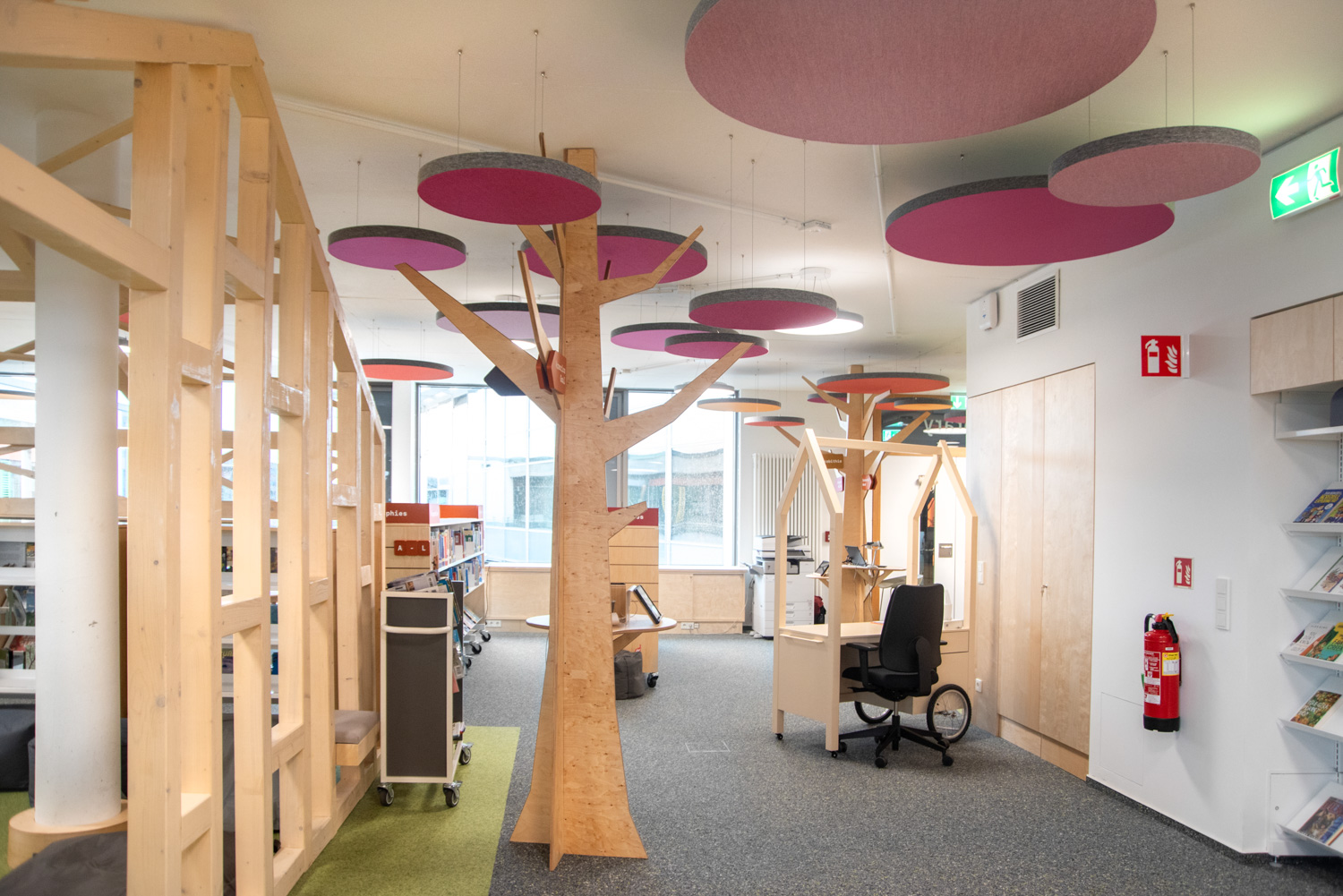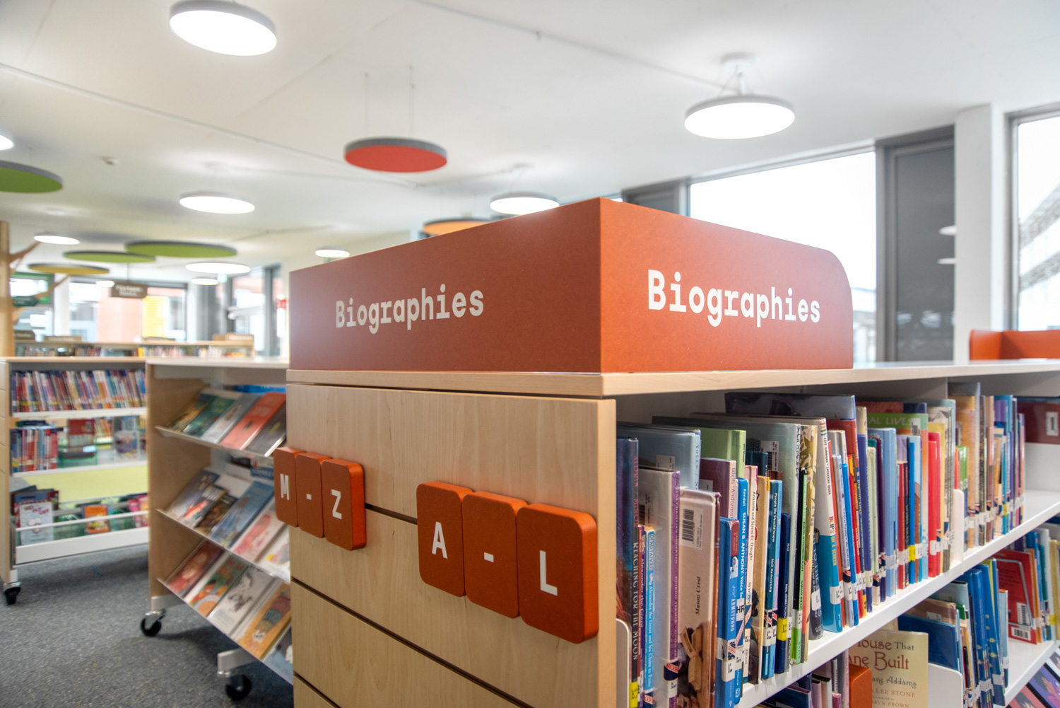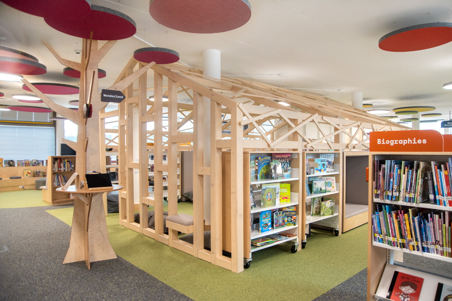 Akustiske loftøer i forskellige farver giver en flot kontrast til gulvbelægningen. På reolernes endegavle er der plads til attraktiv skiltning tilpasset besøgendes behov. Biblioteket er med til at understøtte børn i deres udvikling mod at blive informationskyndige, globale borgere.