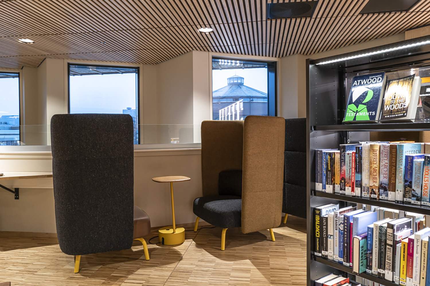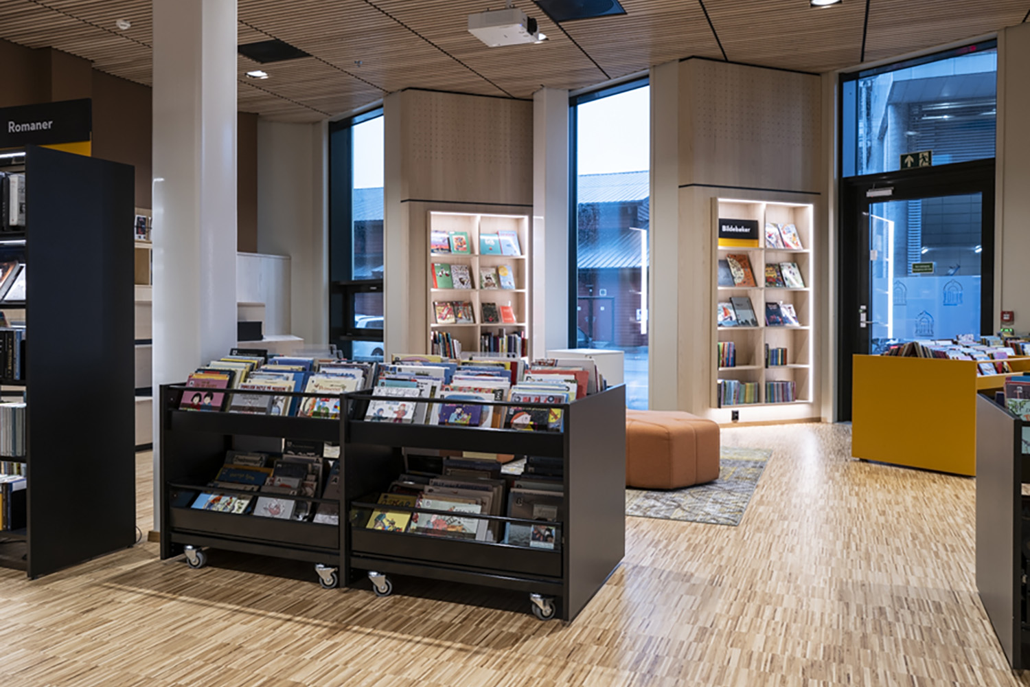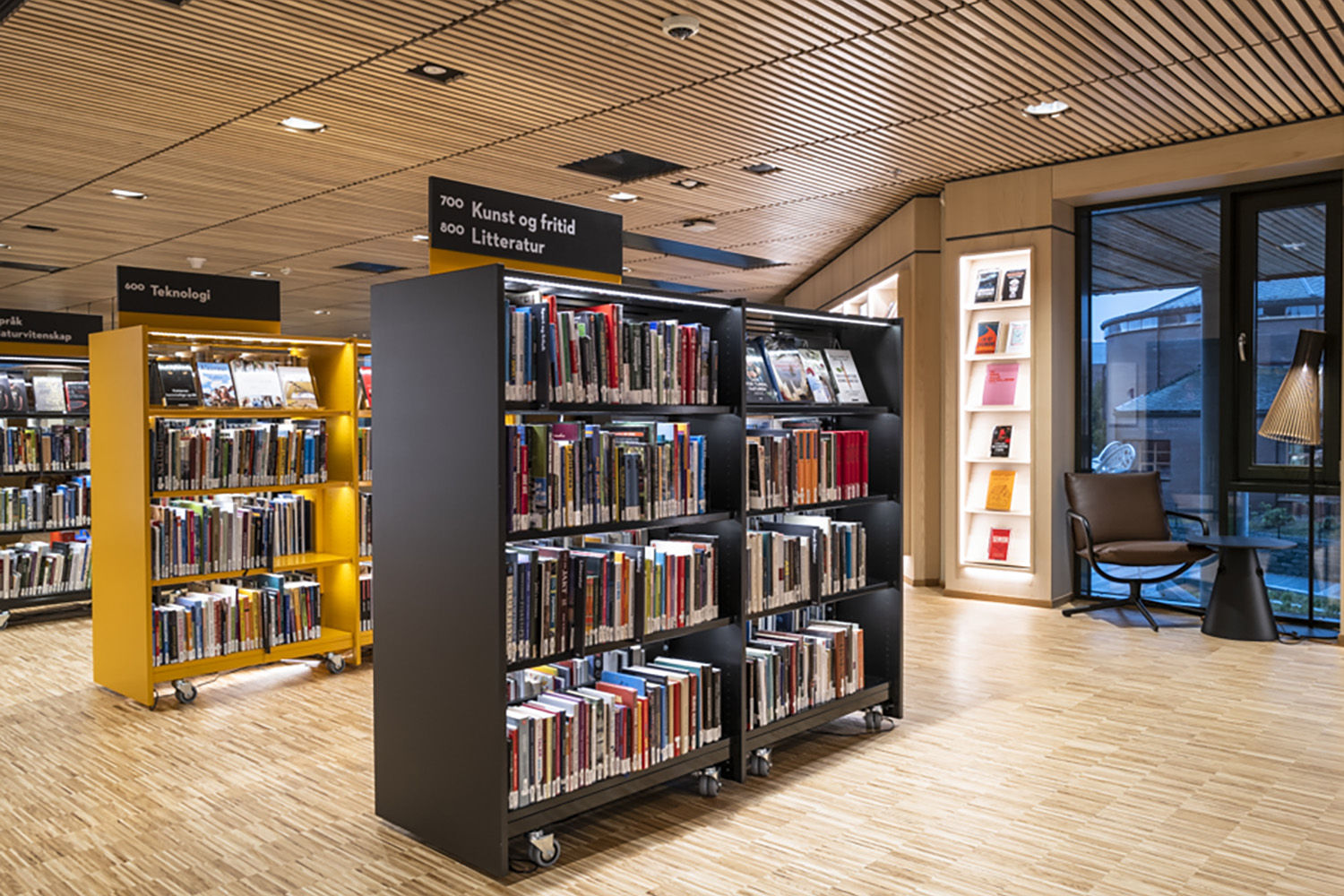 Flere af bibliotekets møbler er med hjul for let at kunne transformere lokalerne til forskellige arrangementer og aktiviteter. På reolernes hylder er der monteret LED-lys for at øge læsbarheden og tilføre biblioteksrummet elegance og funktionalitet.