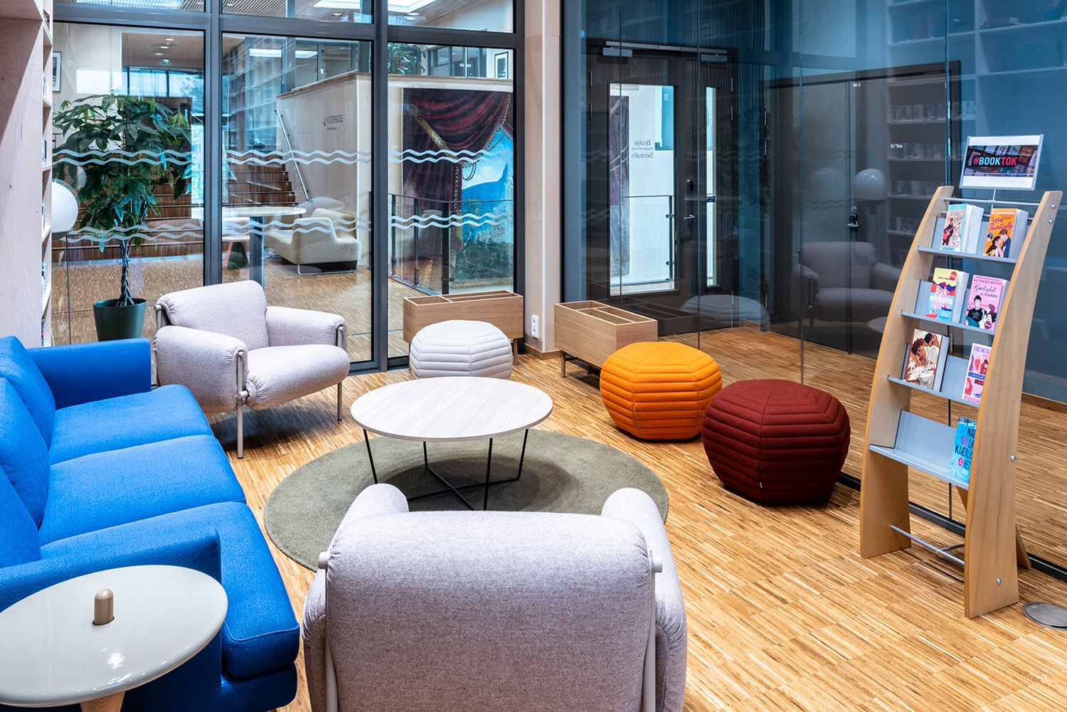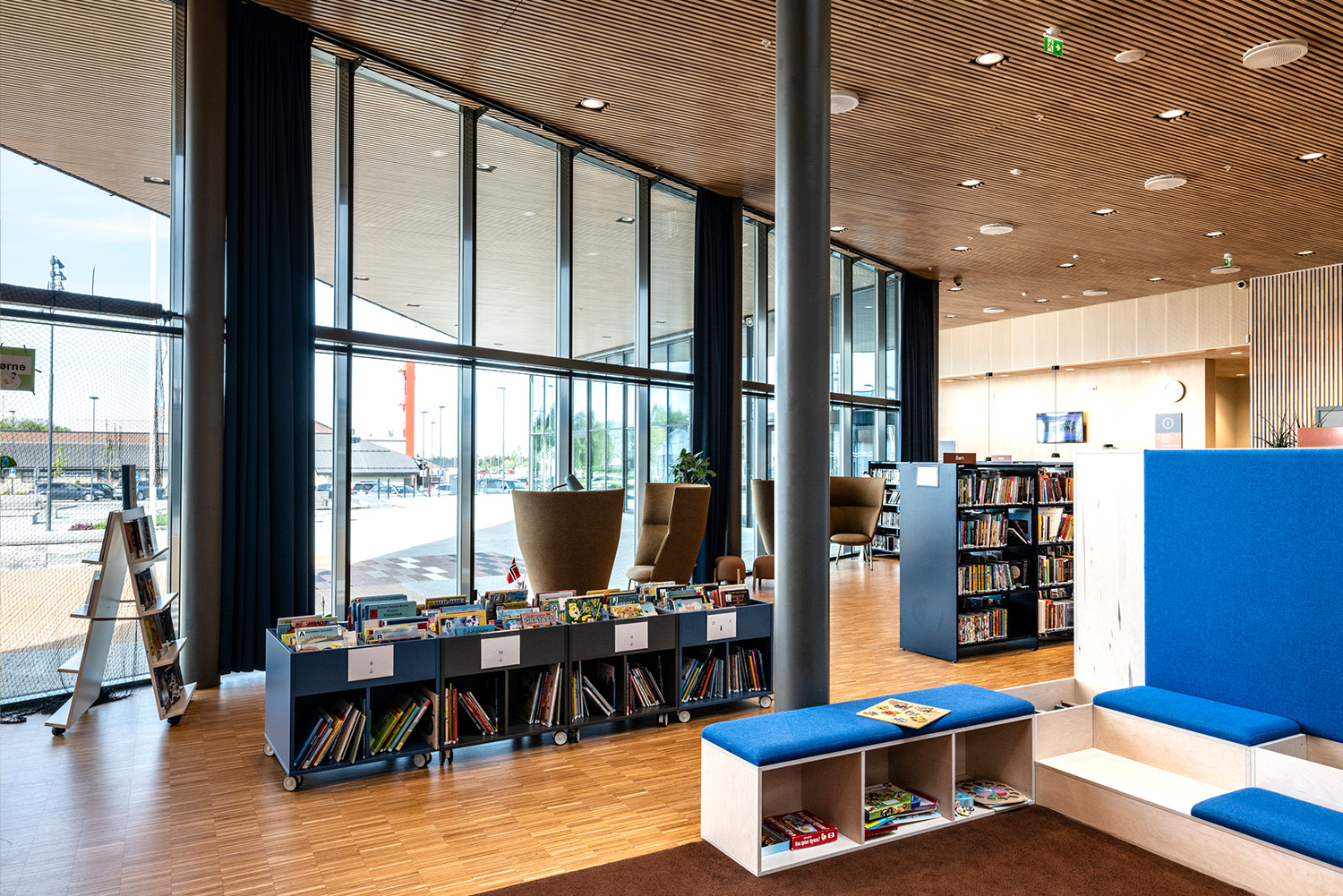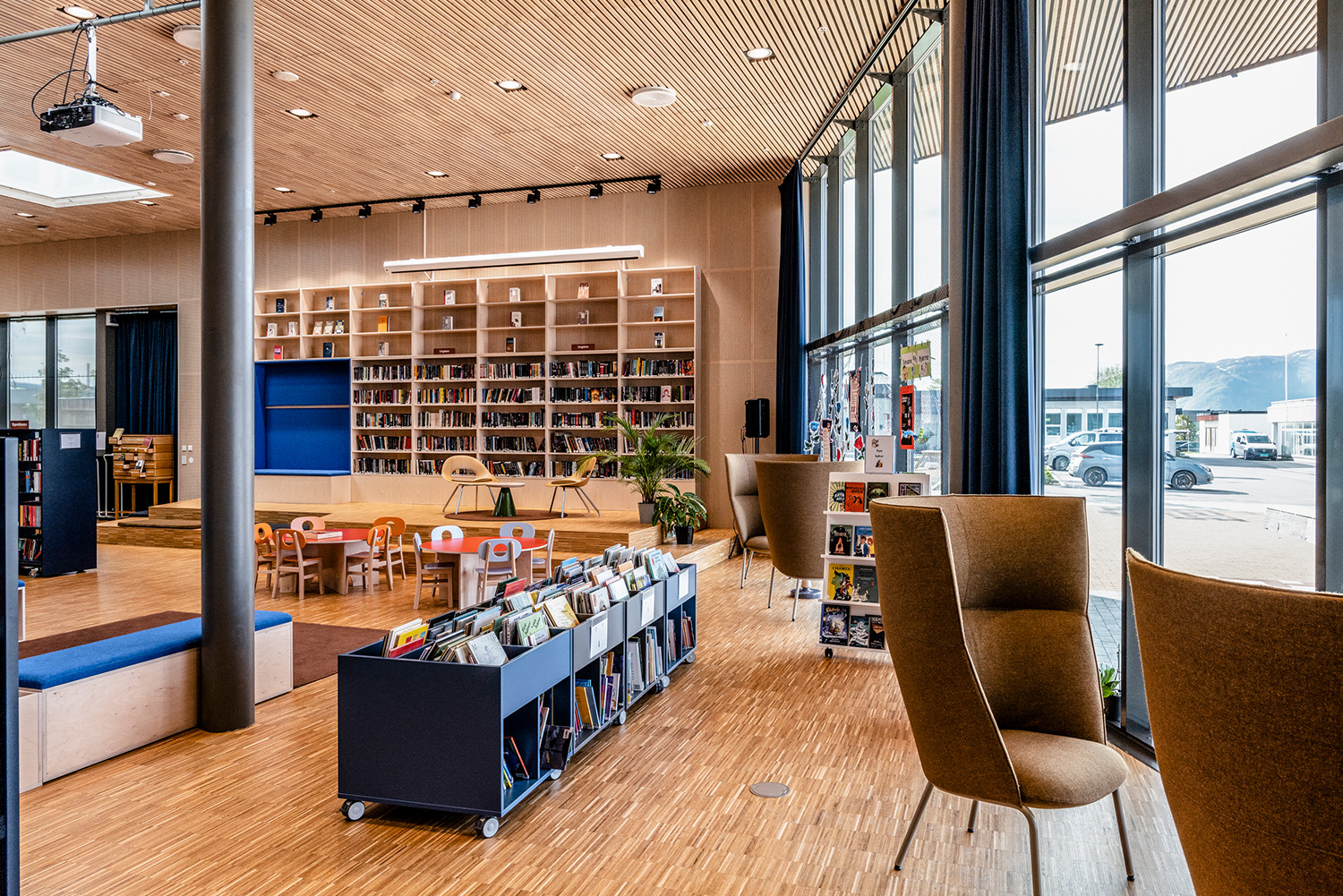 Biblioteket er centralt placeret i underetagen i kulturhuset med højt til loftet og vinduer fra gulv til loft. Desuden rummer bygningen en svømmehal, café, kulturskole og en storsal med 220 siddepladser, der blandt andet skal bruges til biograf, koncerter og teater, ungdomsklub samt kontorer.
