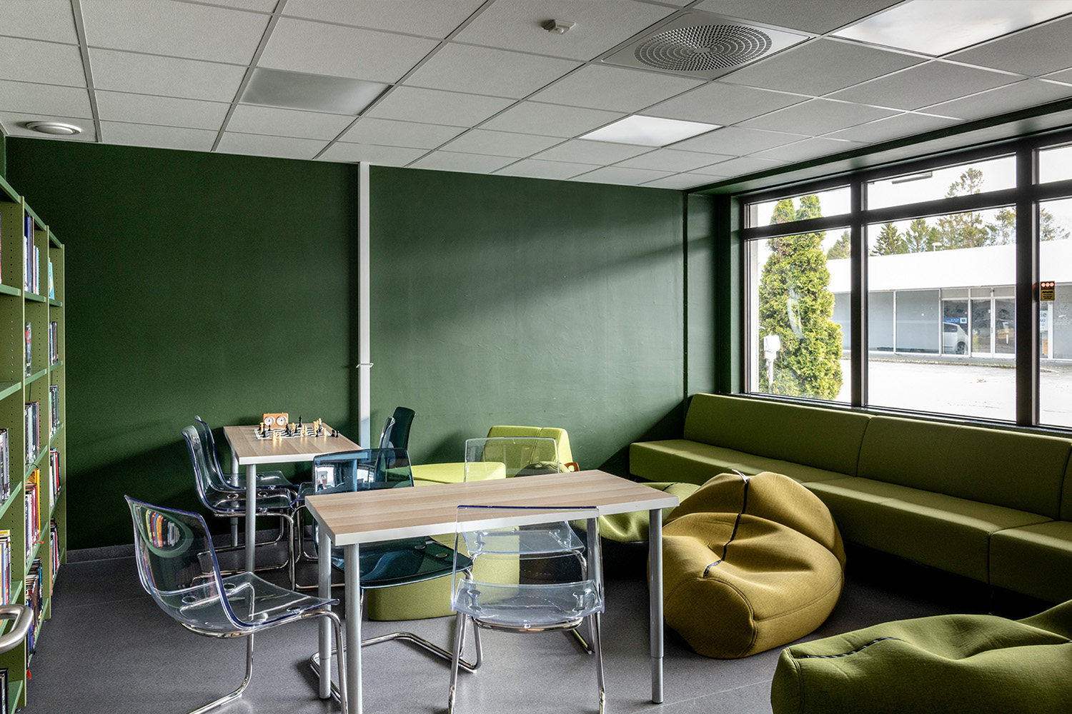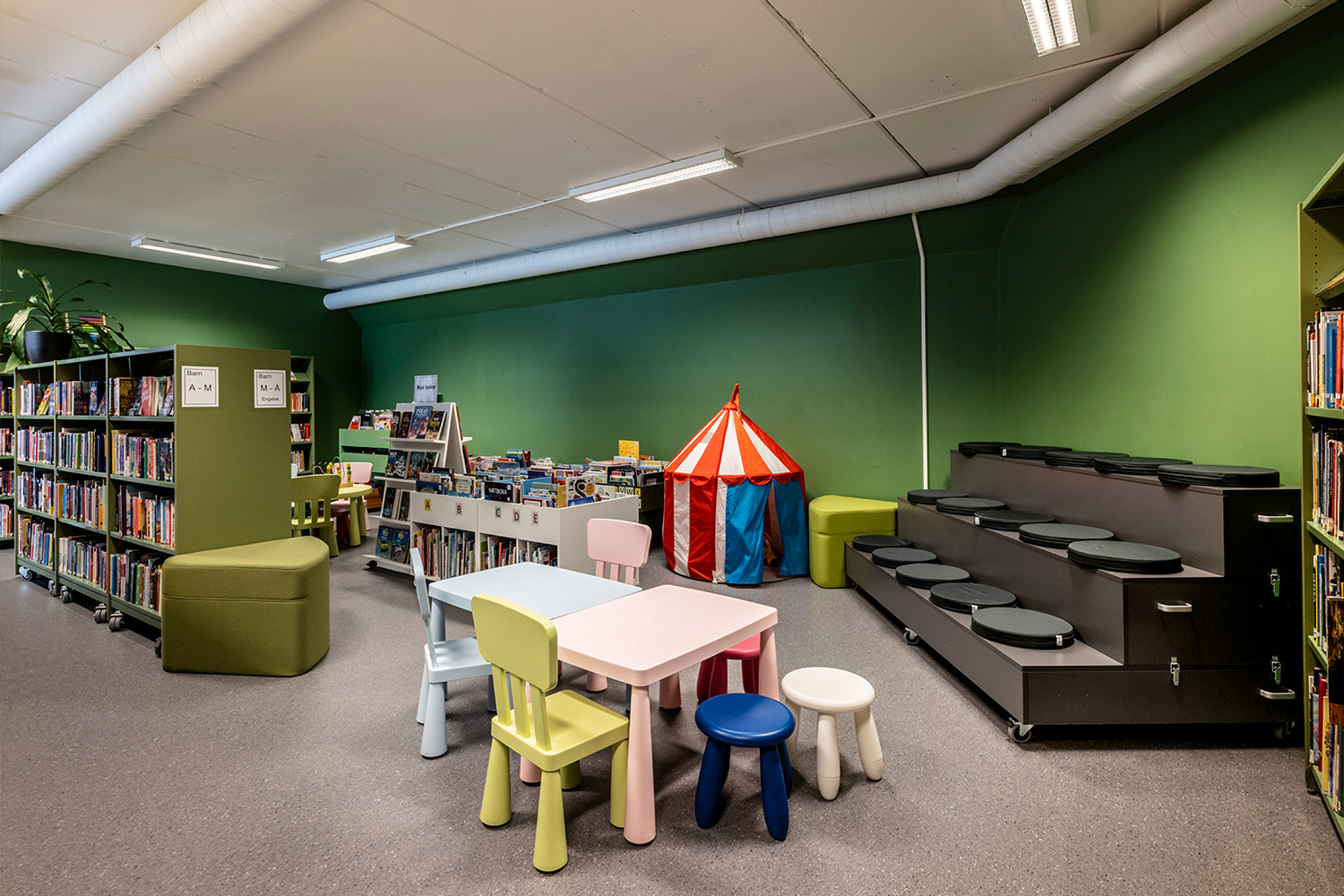 Biblioteket ønskede en god kombination af nye, funktionelle reoler og en skranke samt genbrug af eksisterende møbler og krybber. Det norske designteam hos BS Eurobib har stået for indretningen og farveforslag – herunder i samarbejde med forhandler leveret alt fra reoler, skranke, siddetrappe, udstillingstårne og bogvogne.