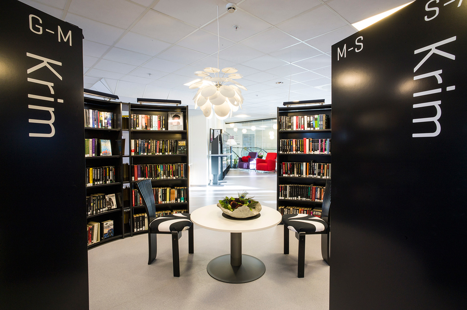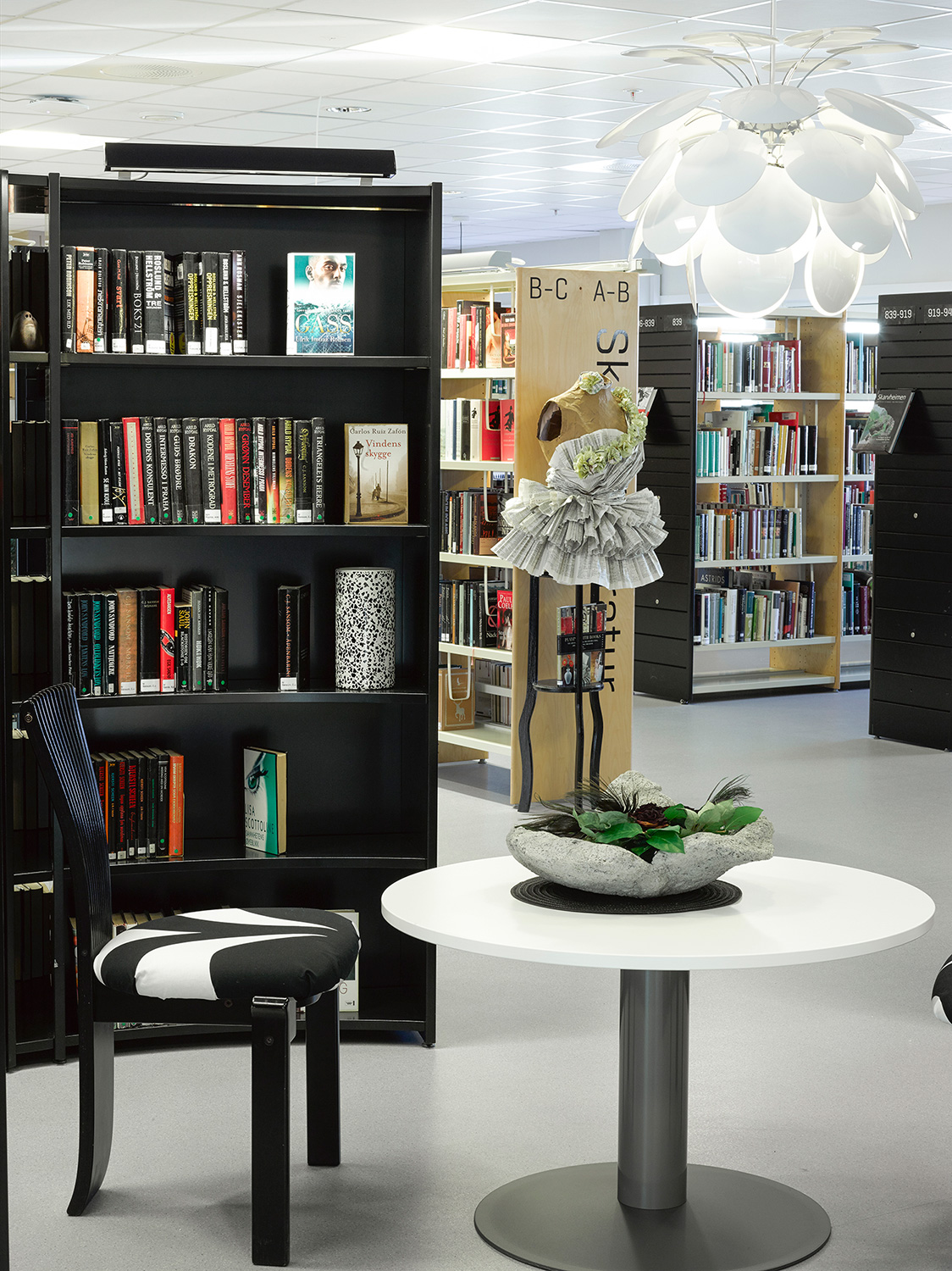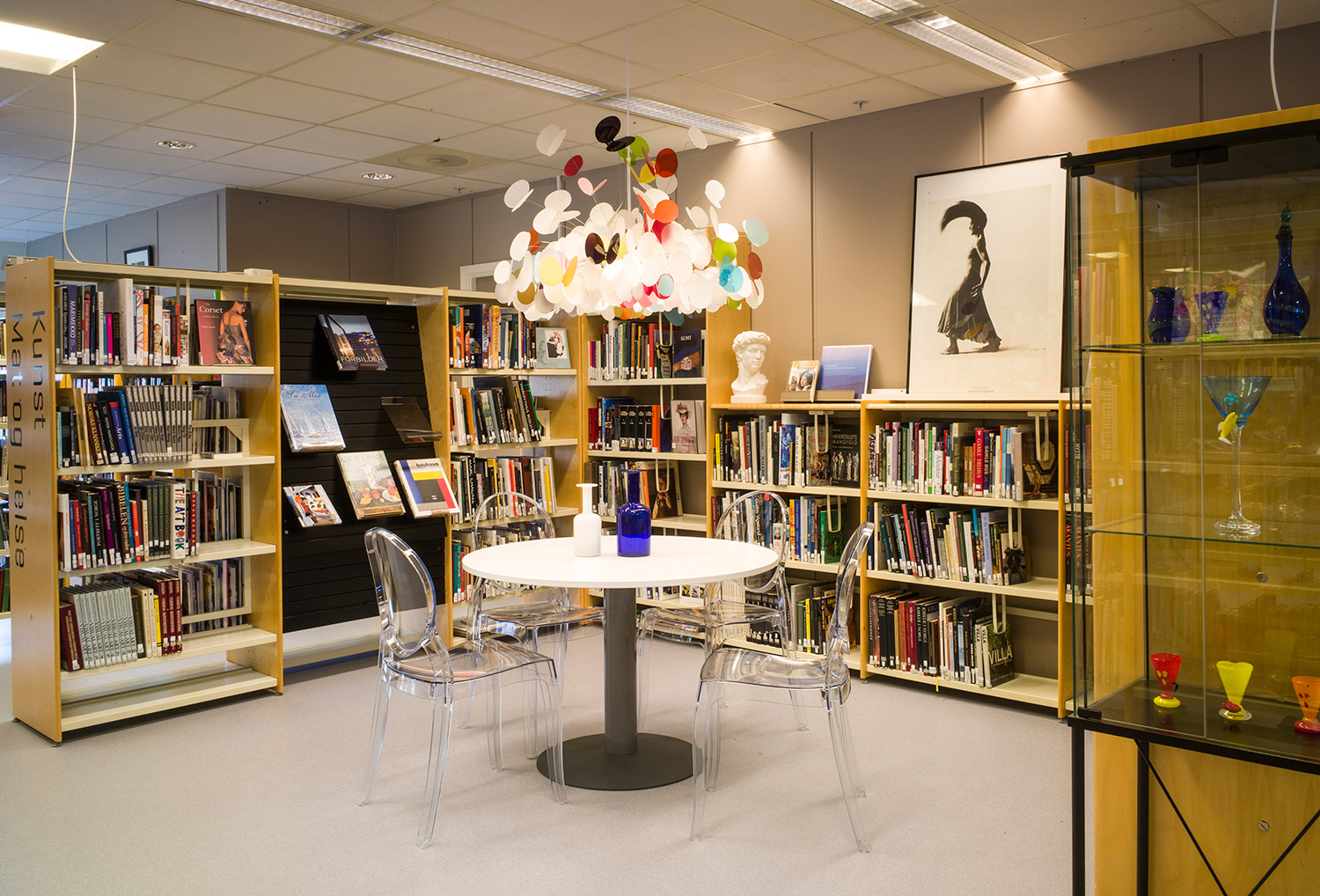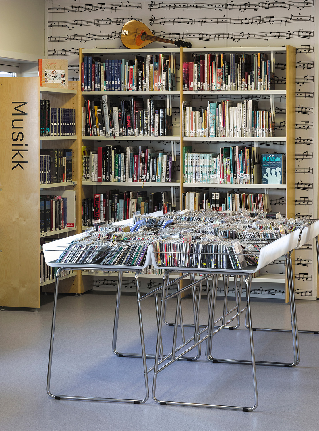 Eksisterende reoler af typen Softline har fået et ansigtsløft med nylakerede udstillingsgavle og skilte. Skranken med hæve og sænkefunktion samt reoler i tidsskriftsafdelingen er også nyindkøbte.