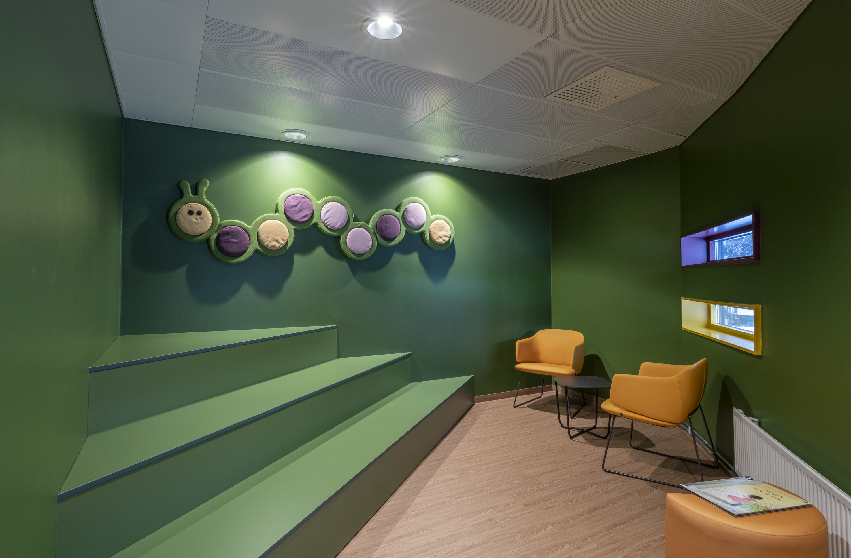 På stueetagen finder man flere afdelinger, der er farvekodet for at gøre det nemmere at finde rundt. Skranken og arrangementsområdet er blevet flyttet længere ind i lokalerne, og på mezzaninen er der blevet etableret moderne arbejds- og studiepladser.