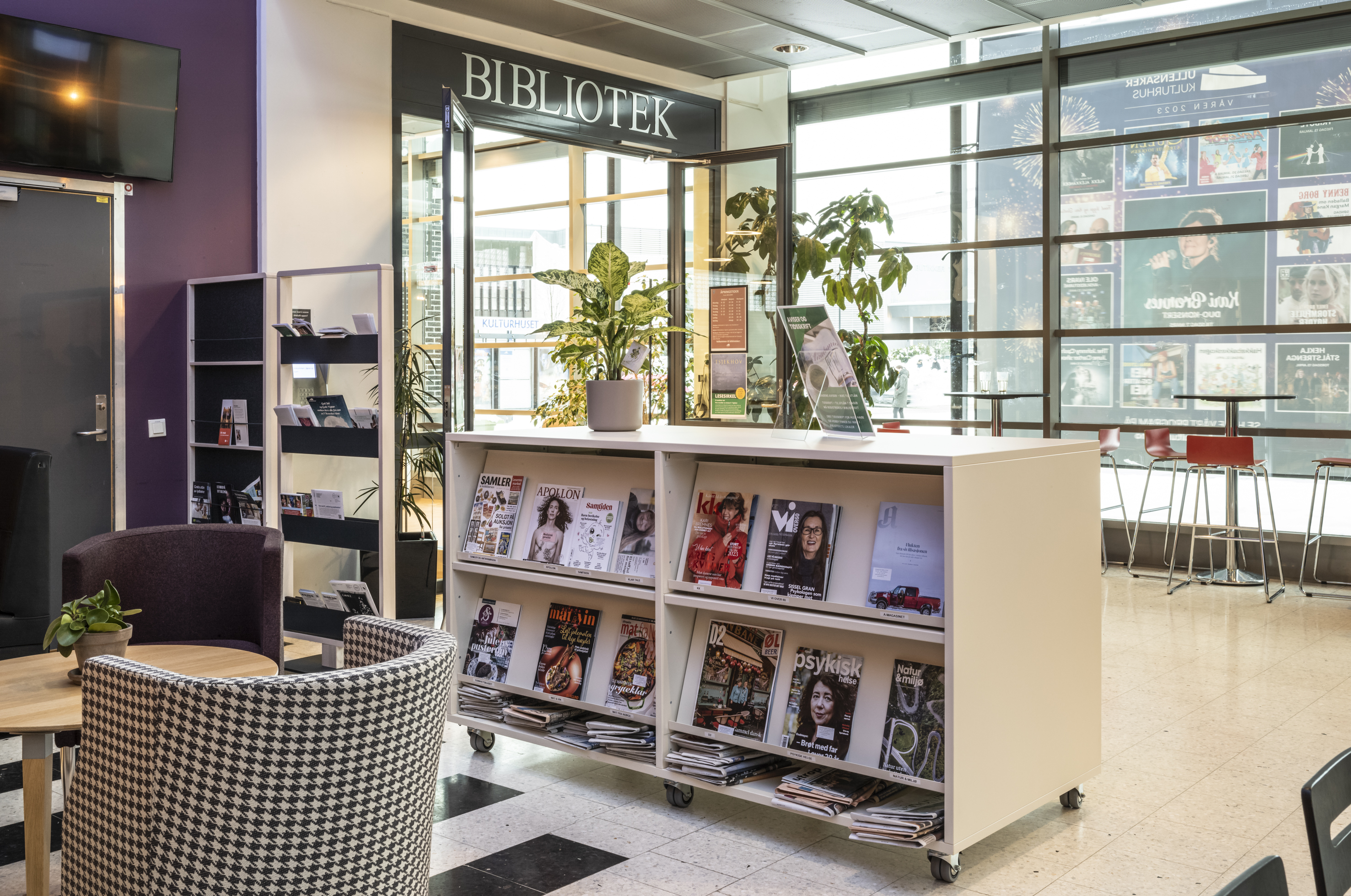 Biblioteket i Ullensaker Kommune ligger i byen Jessheim. Den 5. januar 2023 blev det officielt genåbnet efter en omfattende renovering, hvor alt inventar og reoler er blevet fornyet og farvesat i nuancer, der spiller sammen med grundelementerne i de genbrugte lokaler.