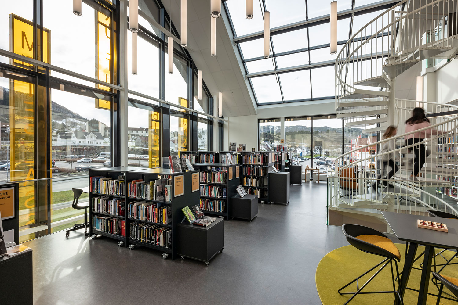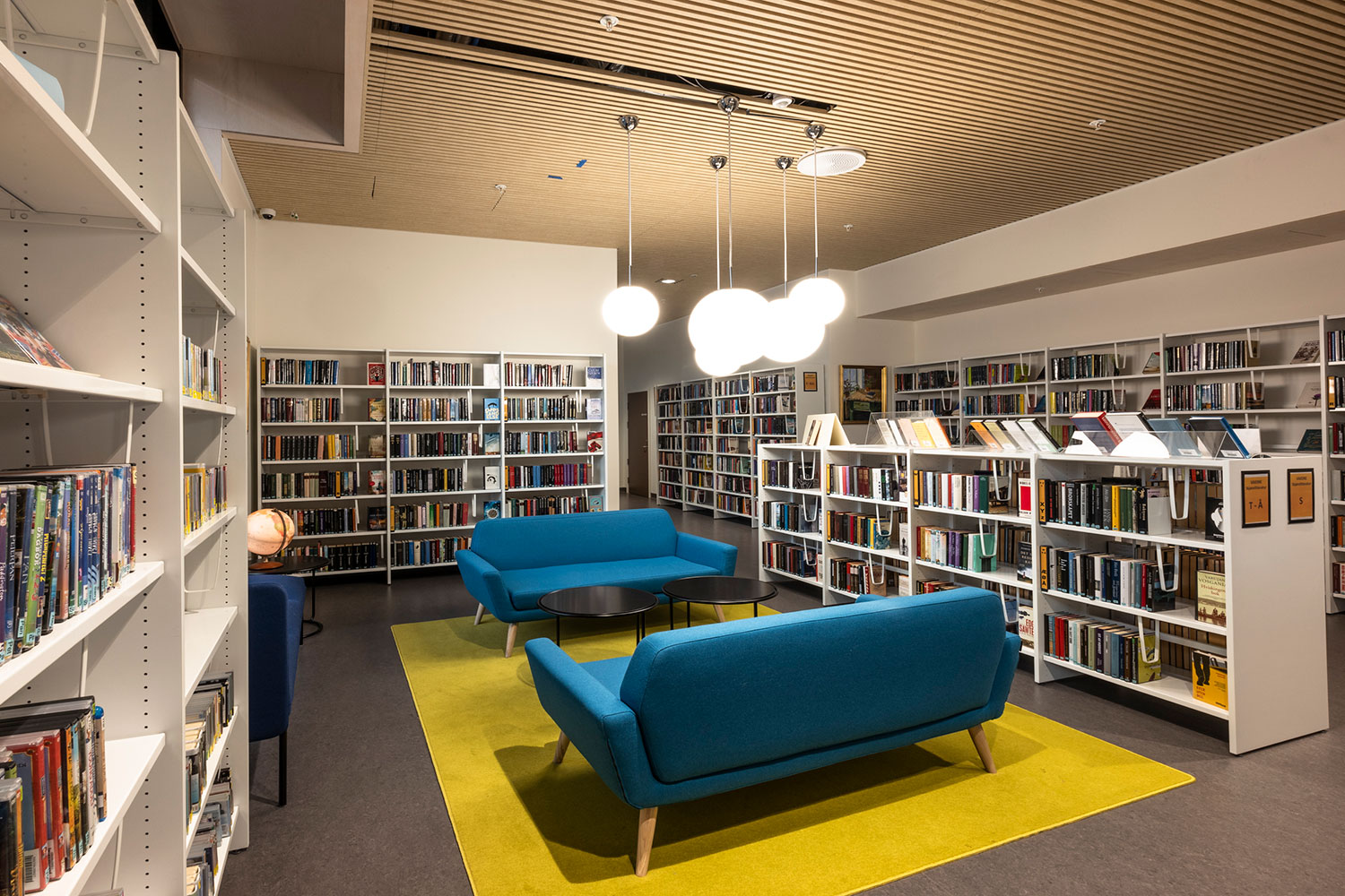 I børneafdelingen er der lave, fritstående reoler midt i rummet og højere reoler ved væggene. Det giver et luftigt udtryk og samtidig et godt overblik. Sammen med de mobile bogkrybber giver det børnene let adgang til bøgerne.