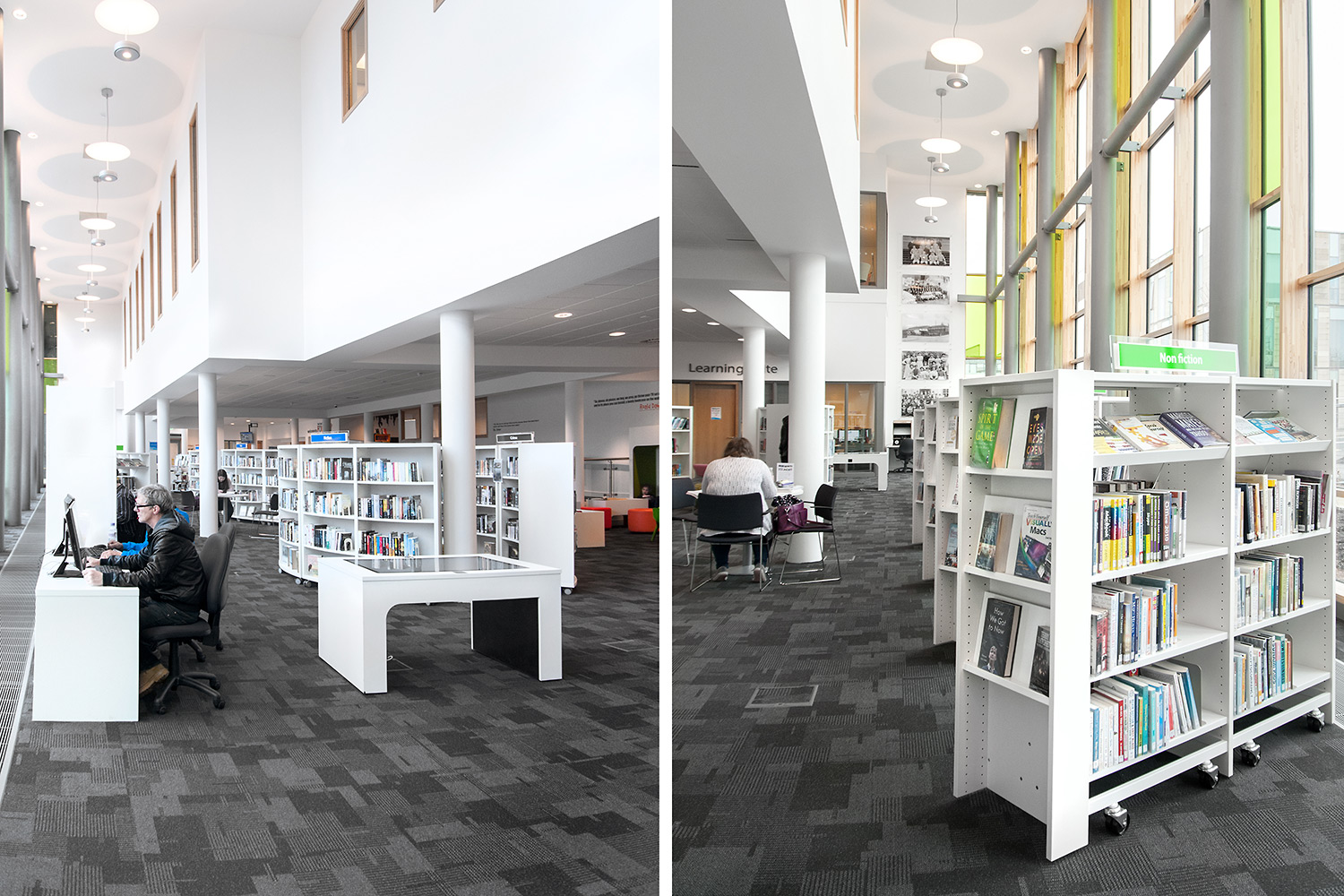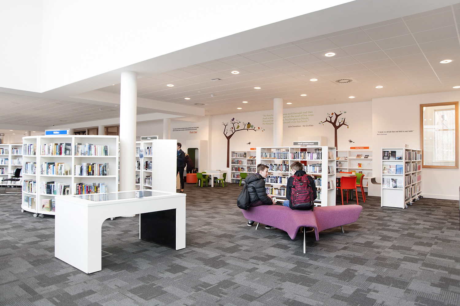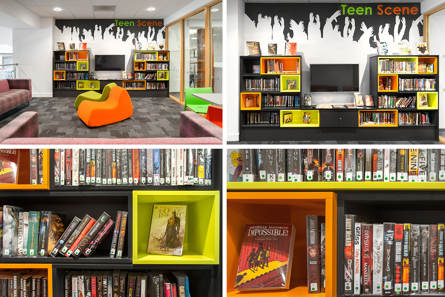 Med innovative bløde siddemøbler rundt omkring i biblioteket kan de besøgende gøre dem det selv behageligt og opfordres til at få mest muligt ud af de funktioner, som er tilgængelige. Teenagers nyder et område kun til dem med livlige vægdekorationer, spillekonsoller og storskærme.