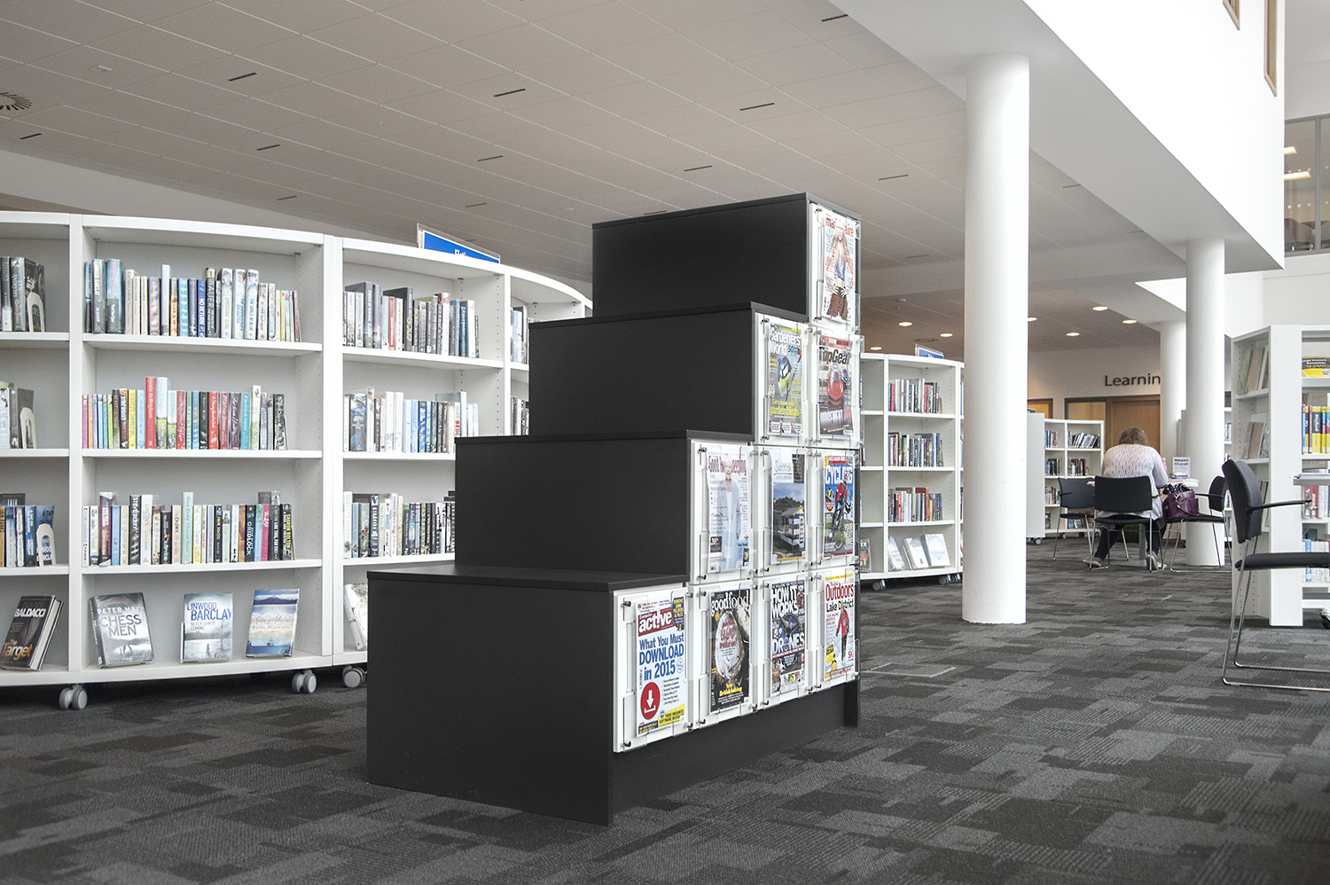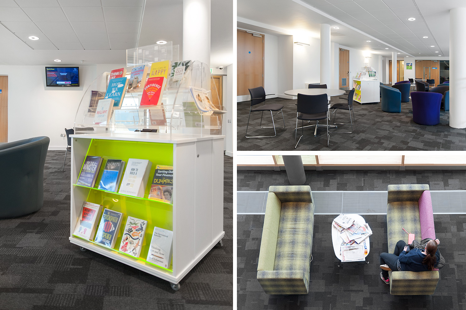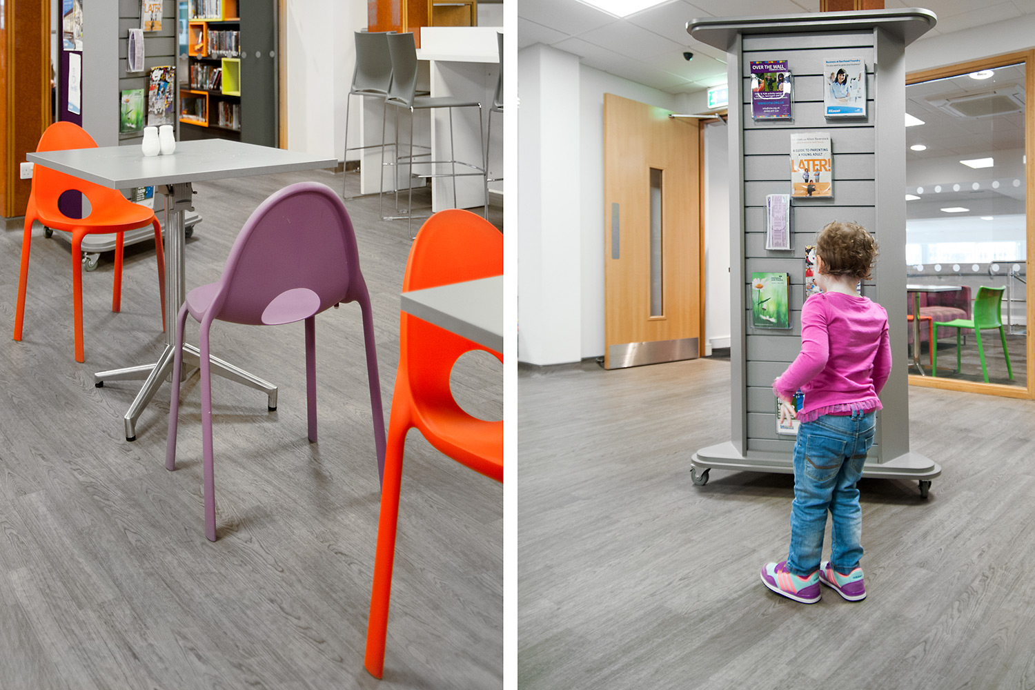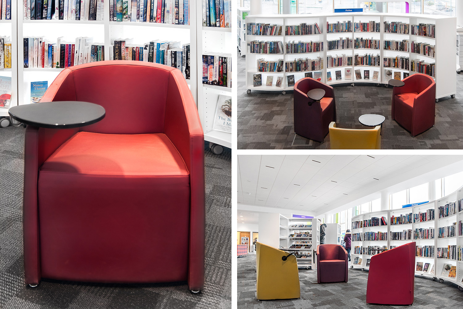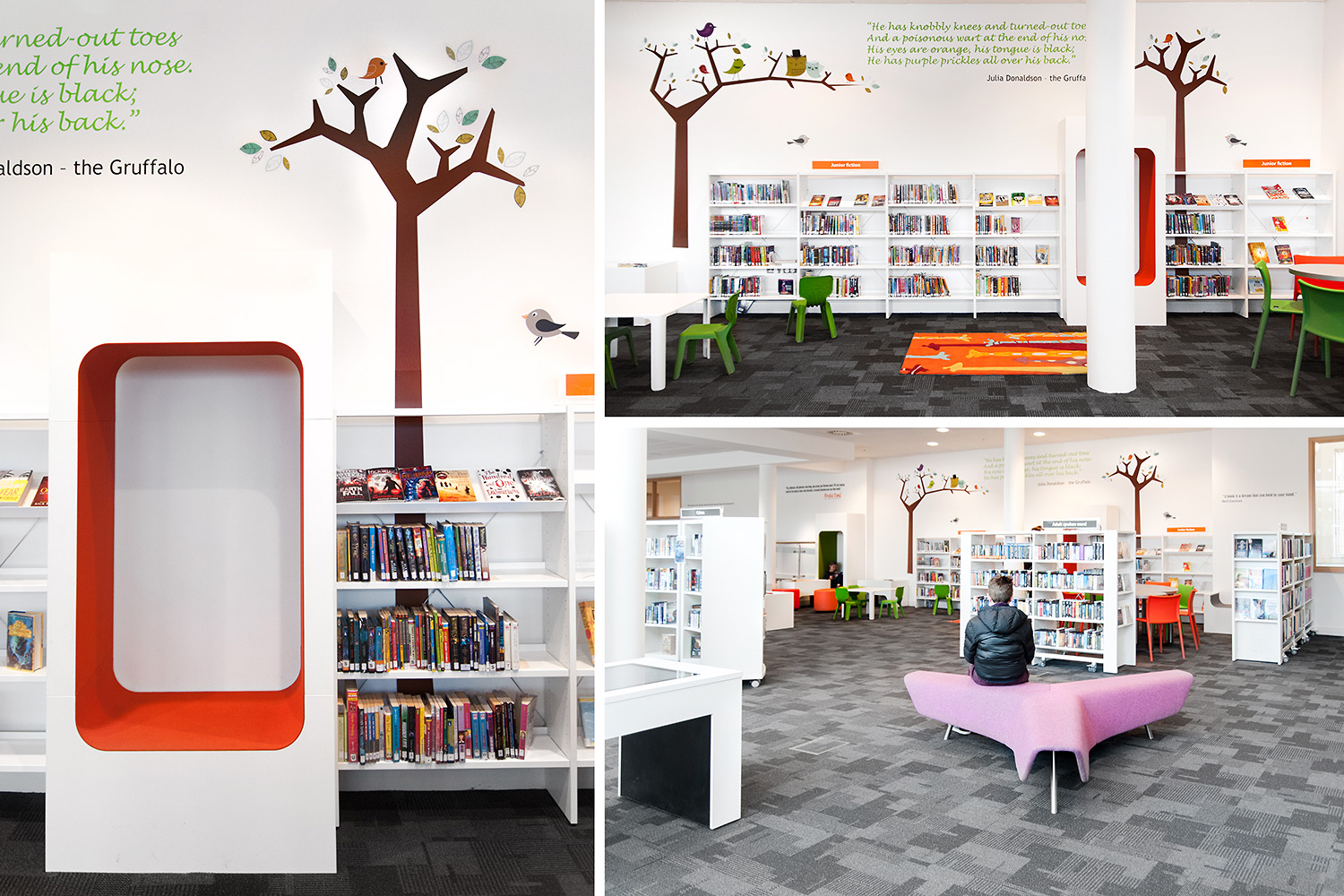 Cocoon serien af modulære møbler findes i hele biblioteket og tilføjer farve, opbevaring af bøger og et sted, hvor de besøgende kan sidde og slappe af. Farverig grafik dekorerer væggene i børneområdet med citater, der inspirerer og opfordrer de yngre besøgende til at læse en bog og bruge noget tid i biblioteket.