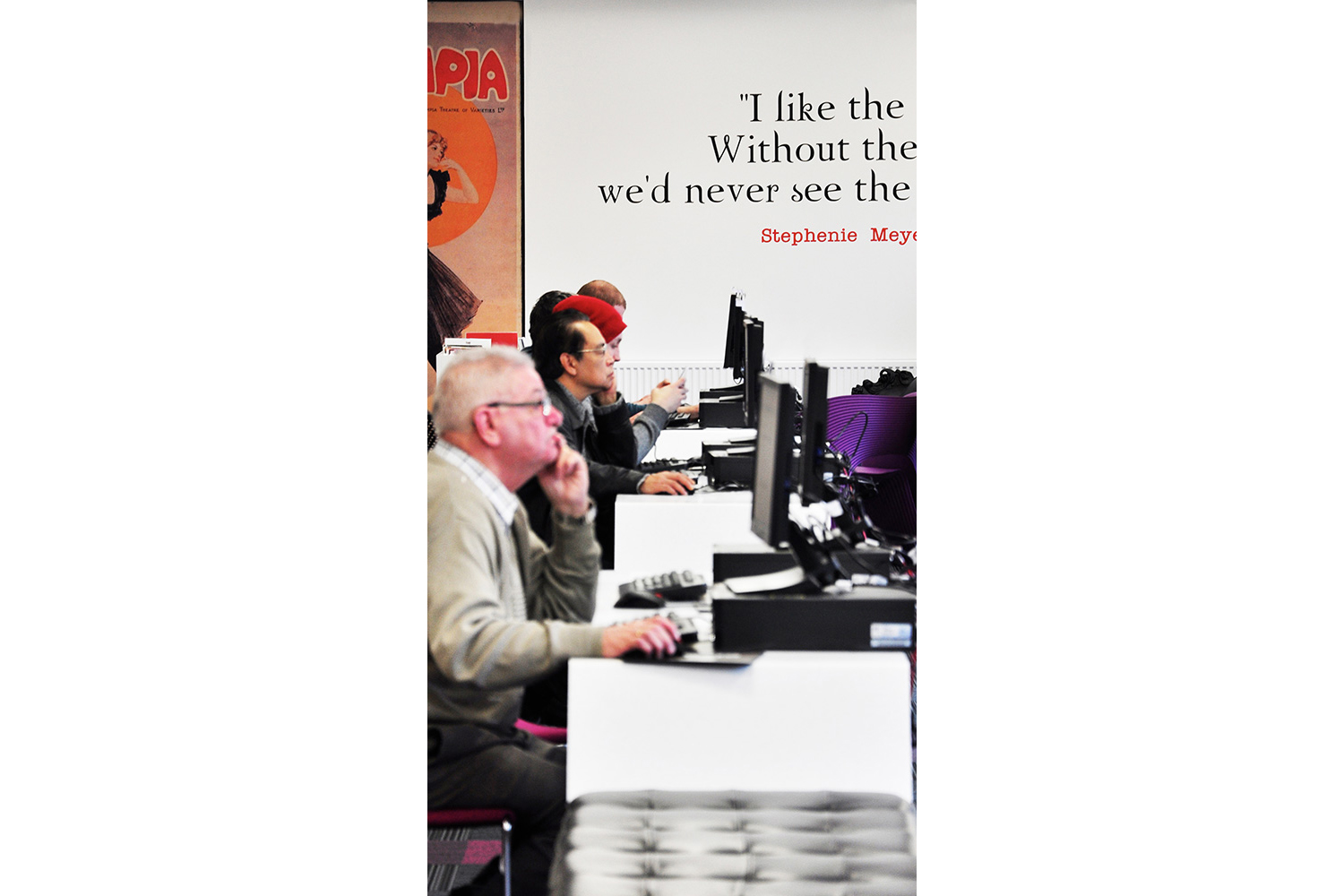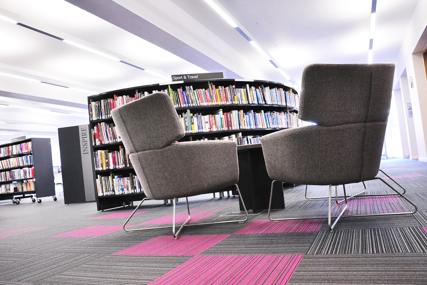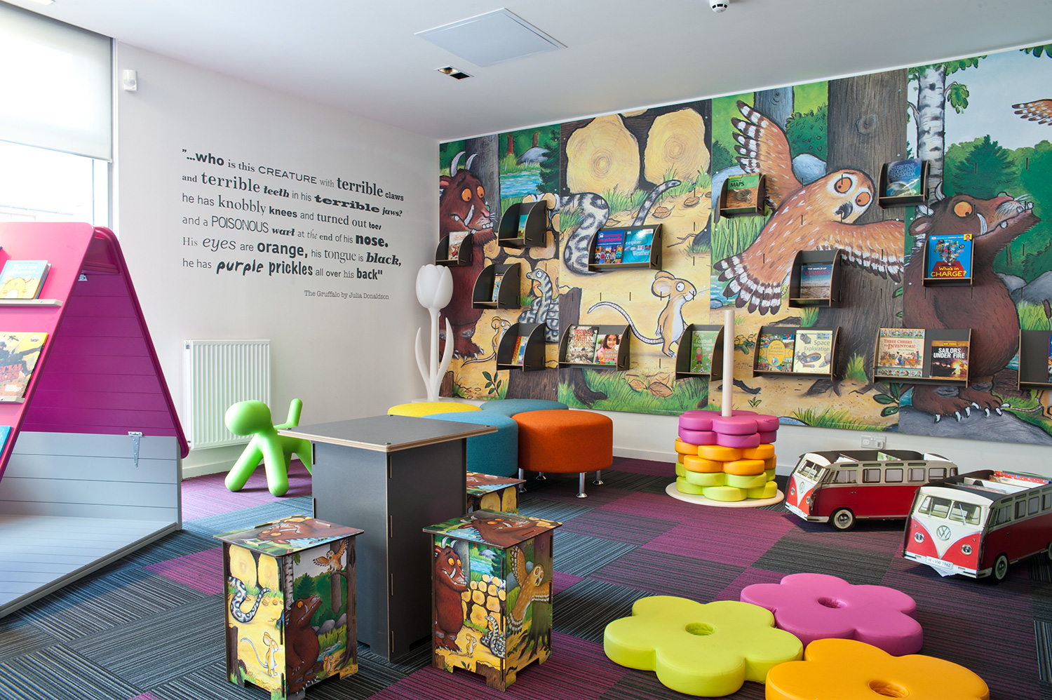 Hovedtemaerne og zonerne i biblioteket er styrket ved brug af grafik og skiltning og med tilladelse af børneprismodtager Julia Donaldson brugte vi hendes populære Gruffalo billeder som væggrafik i børnesektionen og fortsatte dette tema hele vejen igennem til de skræddersyede minimøbler.