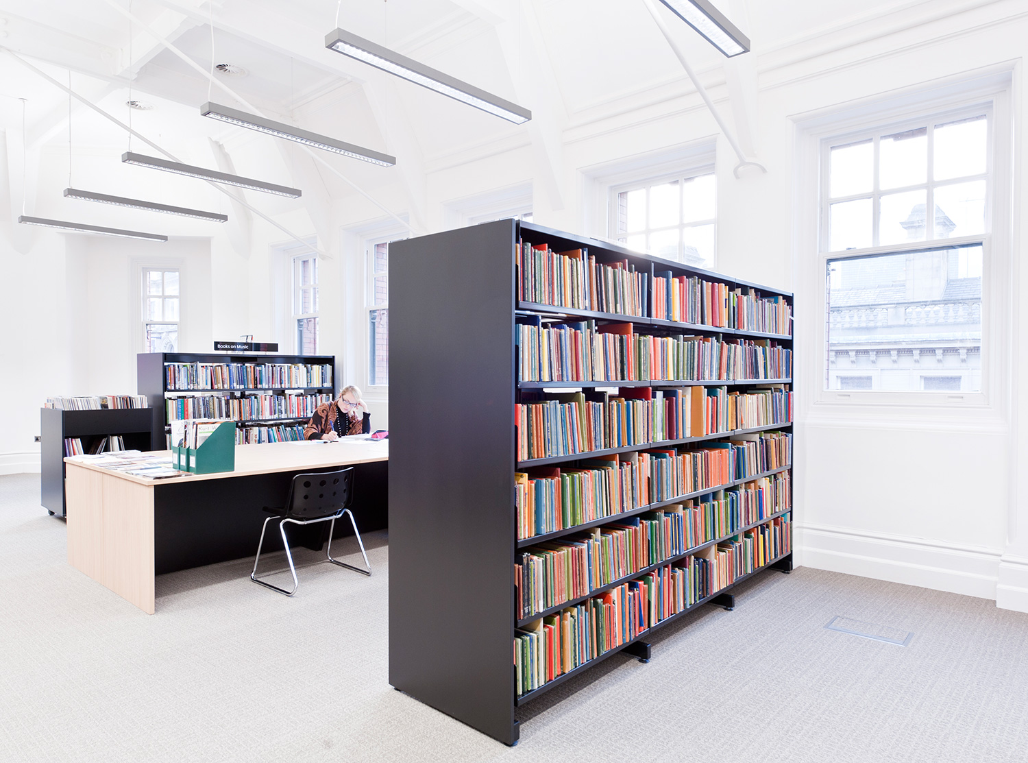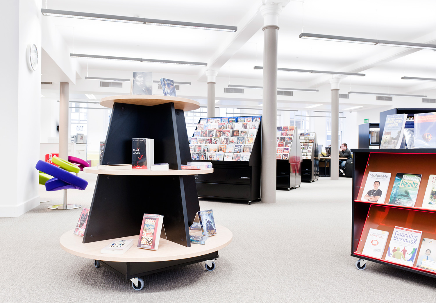 The library is equipped with Classic Steel Shelving System and specially made key pieces of furniture, designed to highlight the current quick pick furniture. The library share the same basic concept as Longsight, Beswick and Brookland, but the unique colour themes and a couple of characteristics details give the library its own identity.