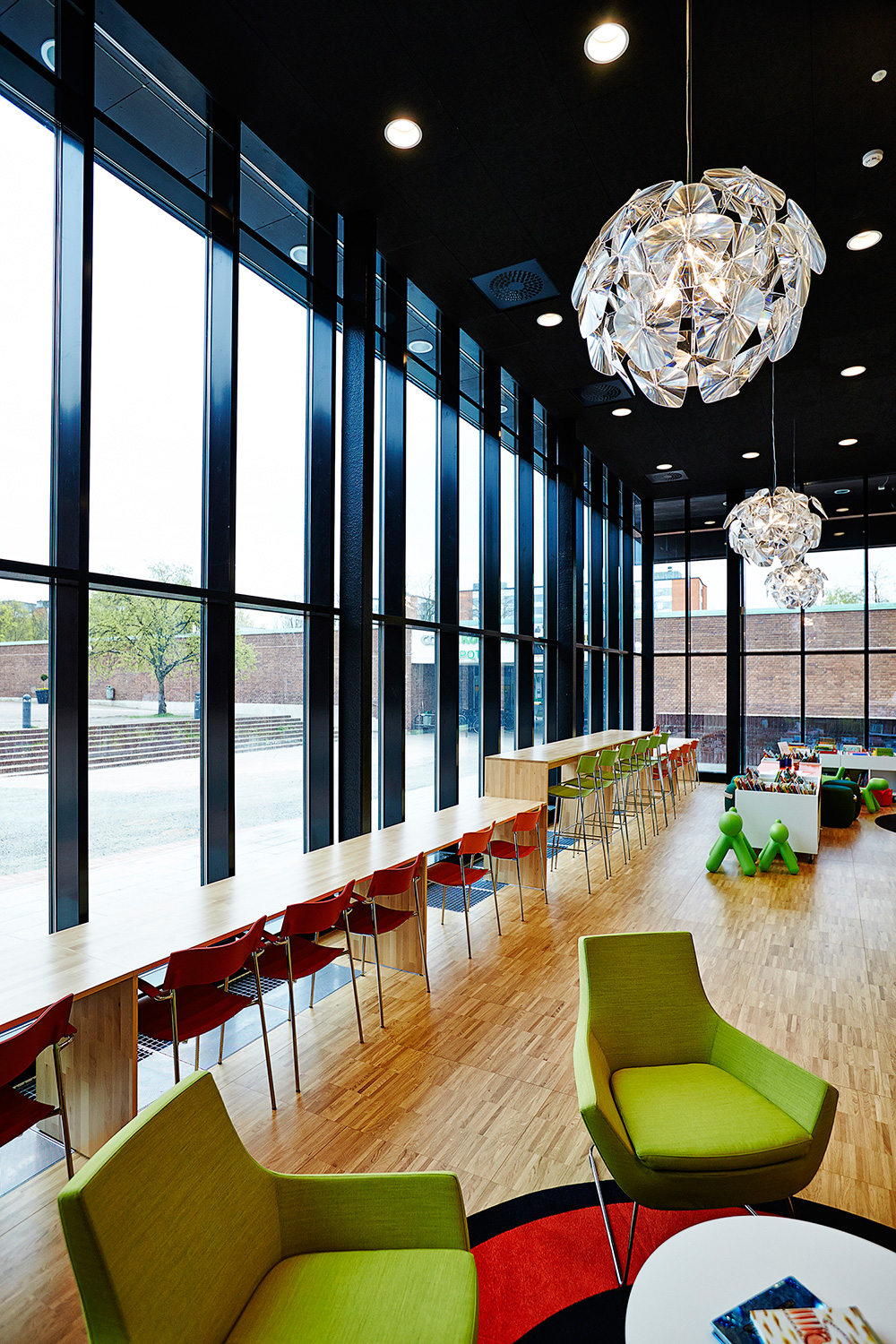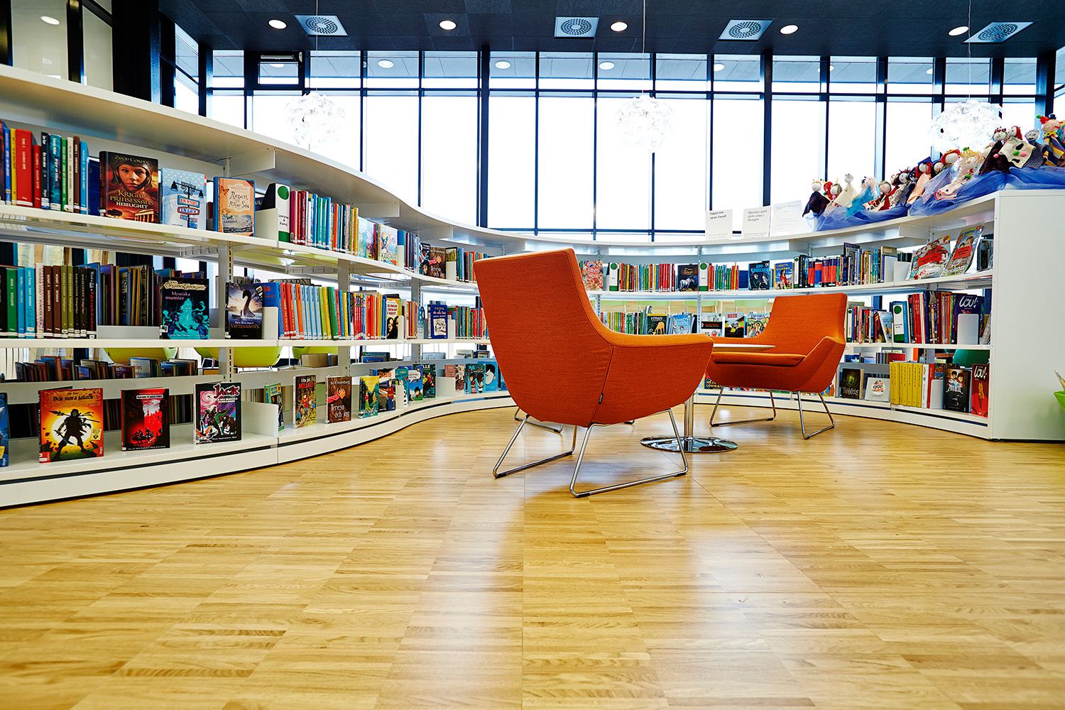 ”Når det kommer til indretningen, er jeg især glad for den lange bænk langs vinduesvæggen med udkig til torvet, hvor det indre og det ydre forenes. Møblerne drager dig ind med de høje møbler bagerst i rummet – meget effektivt! Vigtigt i rummet er det fantastiske buede reolsystem, som snor sig gennem rummets midte. Trods den store størrelse, er den beskeden og skaber kroge og nicher, hvor børnene kan opdage nye bøger”.