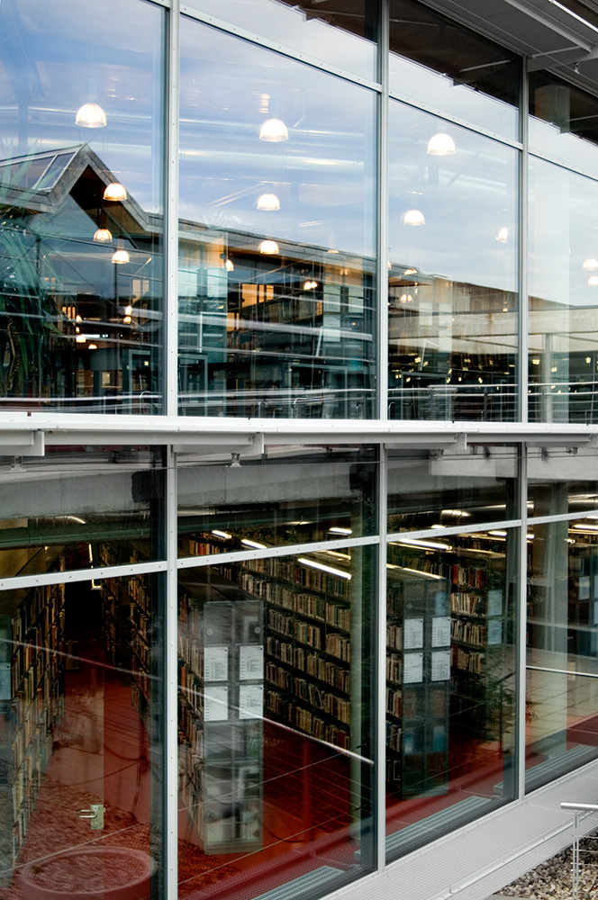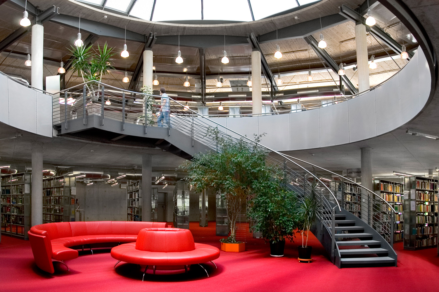 the building to the outside. The organization of the reading hall is an exciting architectural feature of the library, that serves the library uniquely: Shelves, reading desks and lights are arranged in a starshape around a glass dome and the centre staircase. This provides outstanding orientation once you have entered the library.