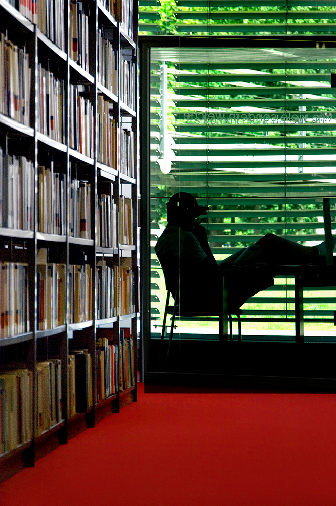 The new, modern library building lies in the centre of the college campus, surrounded by beautiful green landscapes.