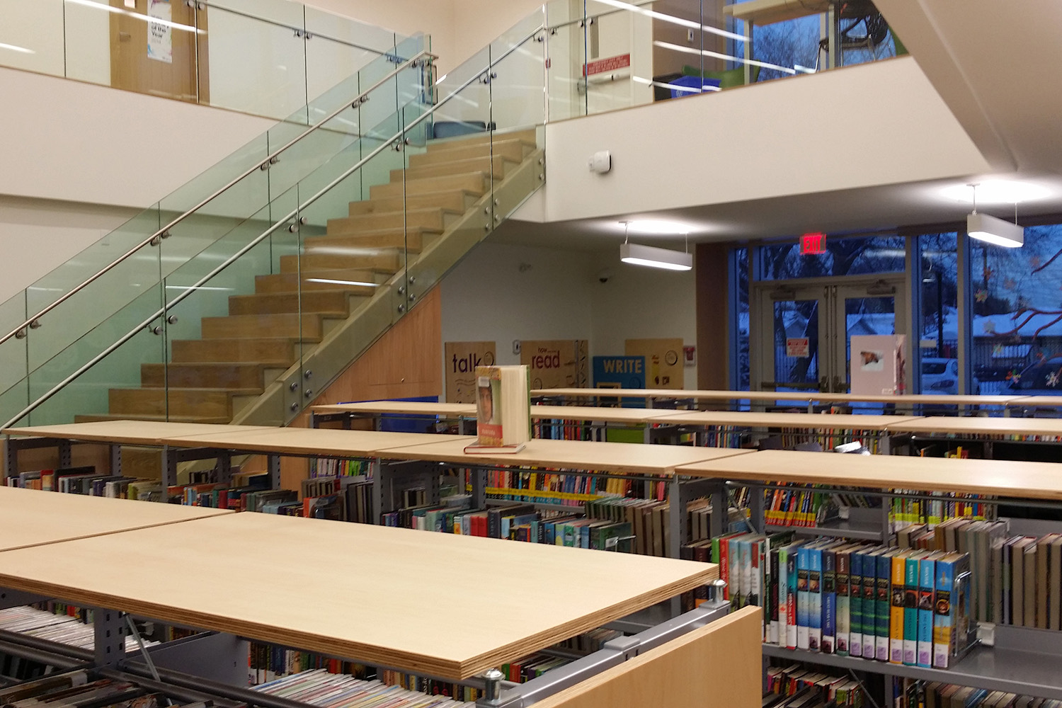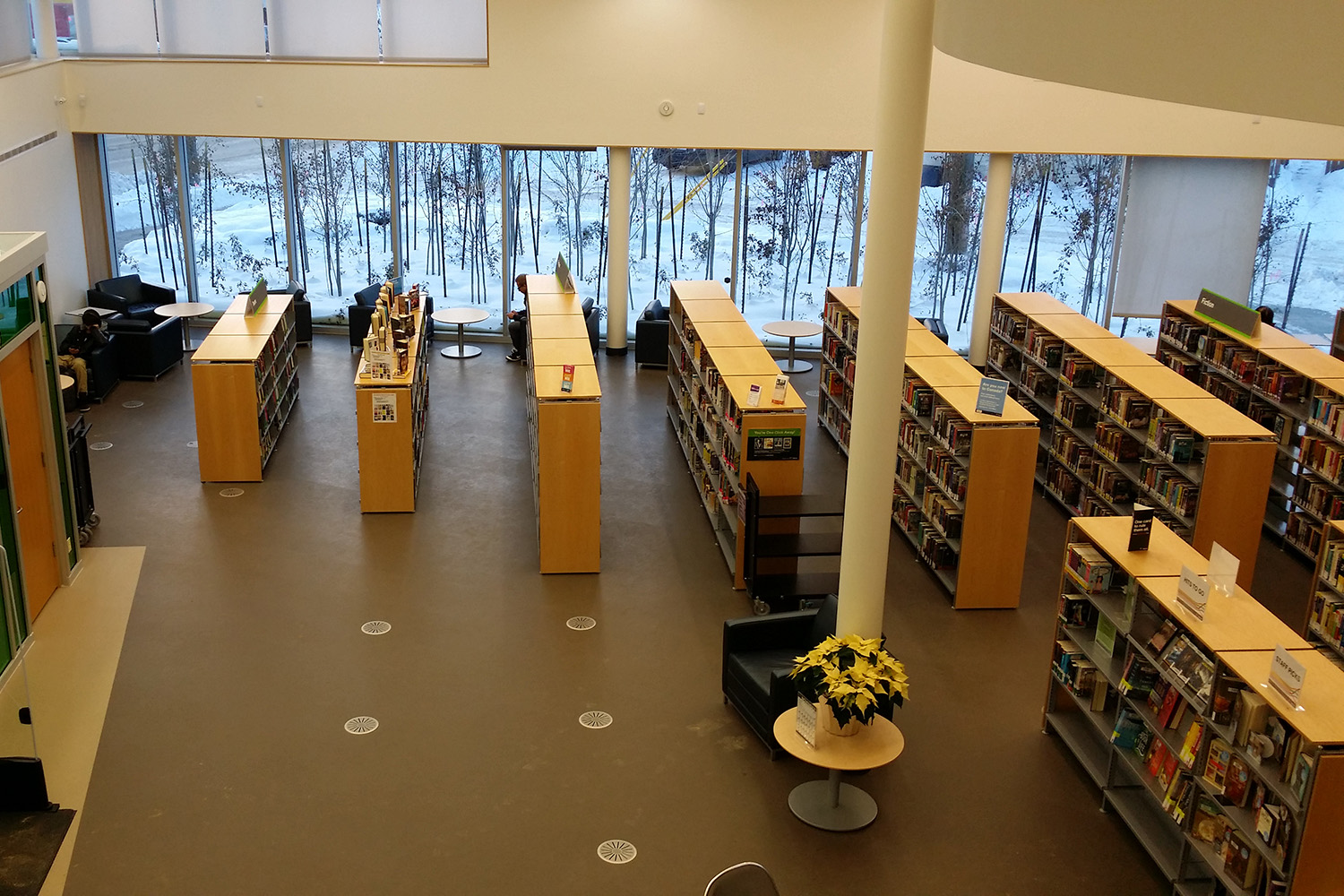 Det nye bibliotek er organiseret som ét stort rum spredt i tre fløje - med fokus på børn, unge og voksne samlinger. Bibliotekarerne opholder sig centralt for at være let tilgængelige og synlige for alle bibliotekets besøgende.