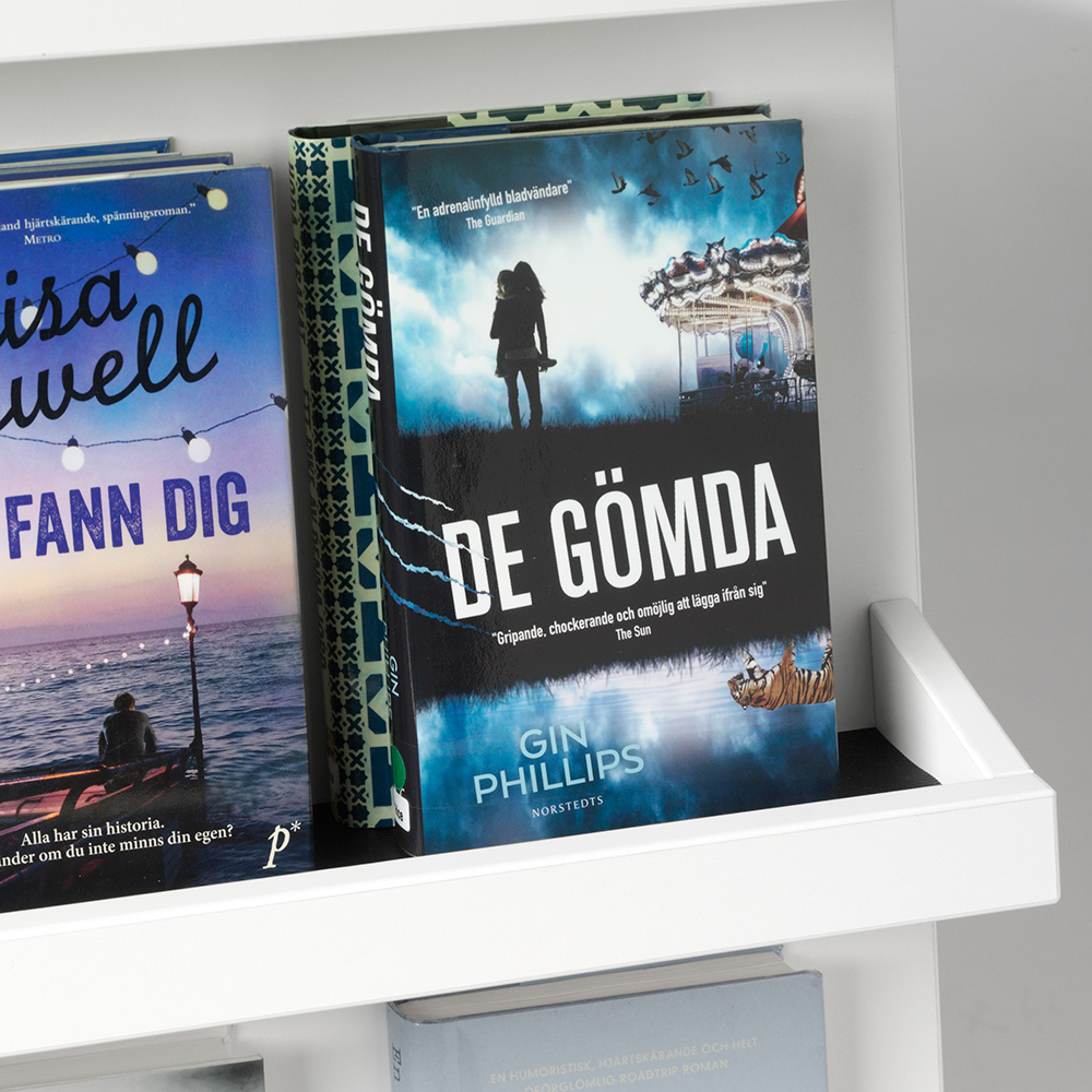 Alle medier kan udstilles med de flytbare hylder. Brug 3 eller 4 hylder med forkant på hver side afhængigt af bogformatet.