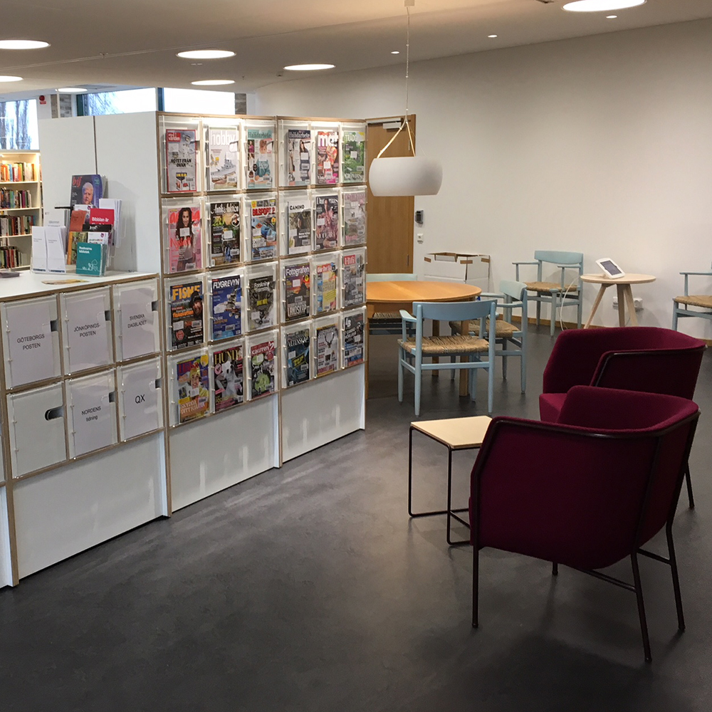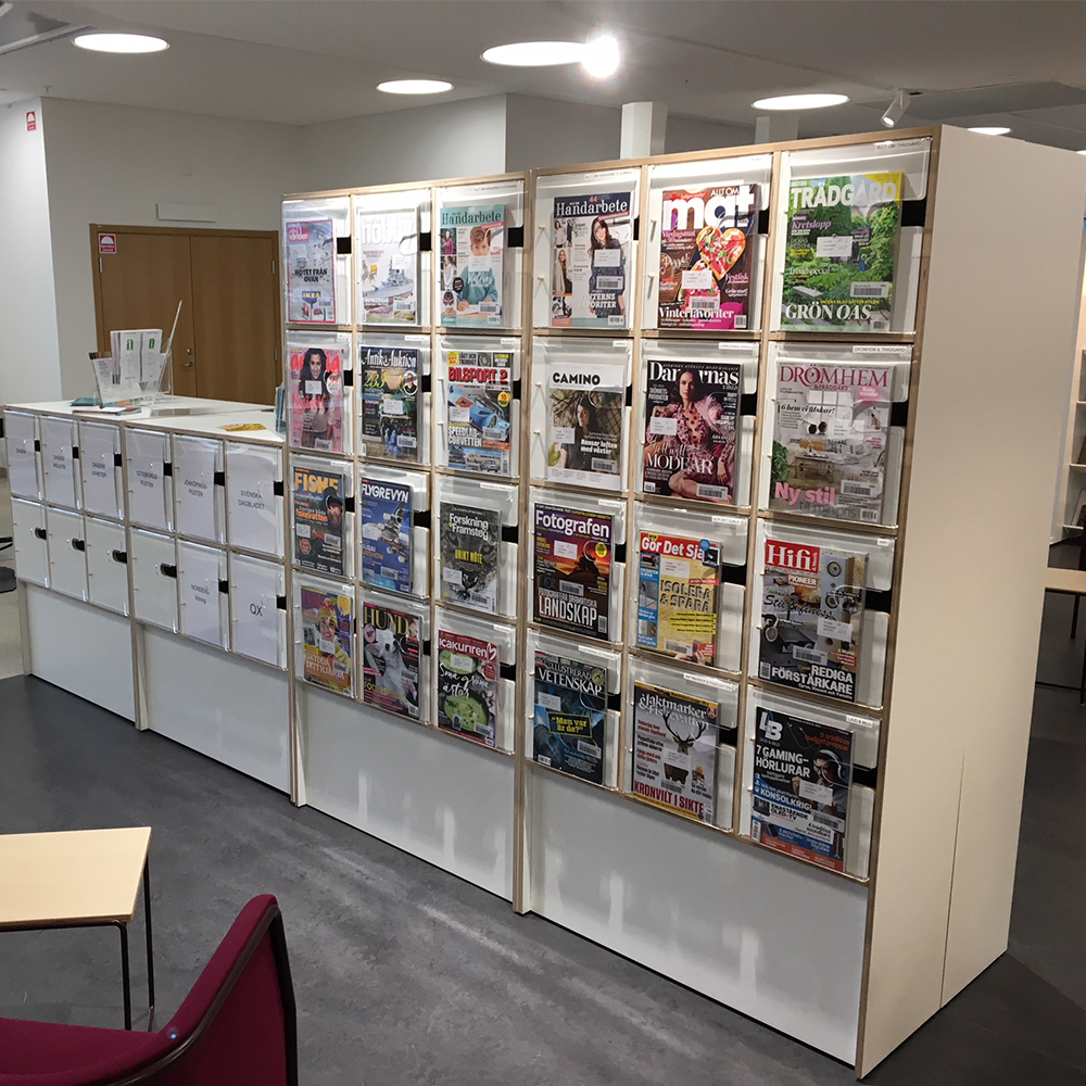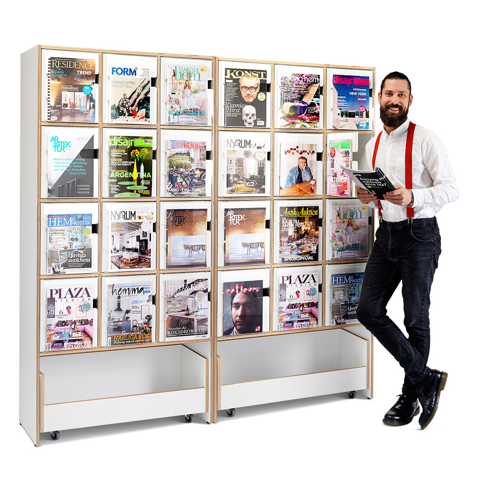 Slank ergonomisk udformet møbel til tidsskrifter, magasiner eller andre seriepublikationer. Frontlågerne med klar akryl til display har generøs displaydybde.
