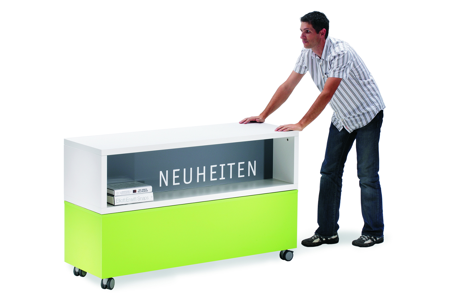 Et tre-delt mobilt system, der gennem et drejeled og en samlende ramme giver mange muligheder for udstilling og brug. Indersiden og frontdelene kan fås i kontrastfarver, og med supplerende grafik og/eller tekst kan dette møbel virkeligt fremhæves.