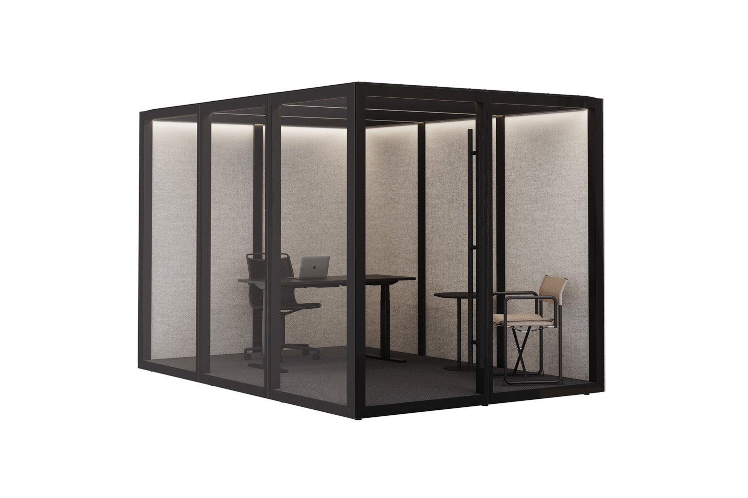 Zen Pod® kombinerer avanceret lydabsorberende teknologi med elegant design. To af væggene har akustikglas, mens de øvrige to vægge er lydabsorberende og beklædt med tekstil på inder- og ydersiden. Loftet er ligeledes lydisolerende med et behageligt lys.